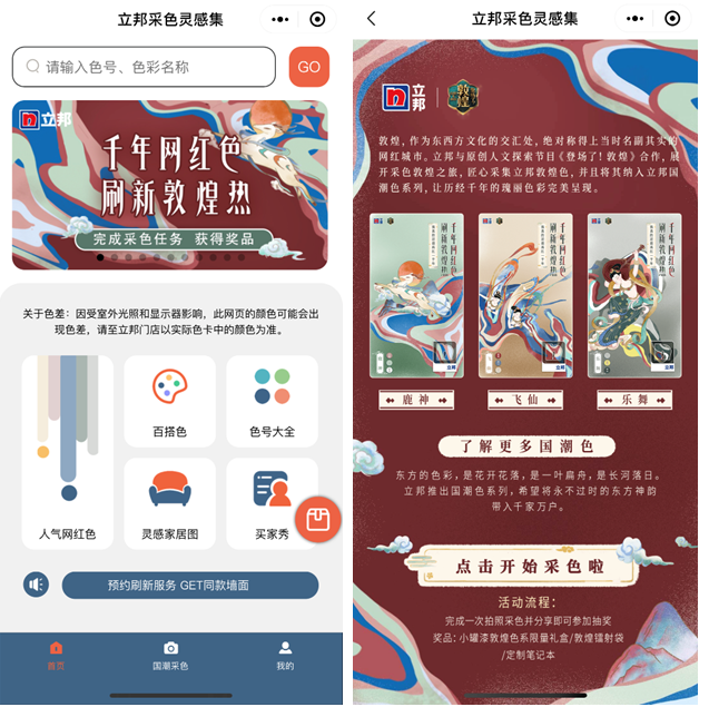 《登场了!敦煌》邂逅敦煌 青春视角解锁千年奥秘 作为国内首档以“采色”为立意点,以保护敦煌传统文化为核心的综艺节目,《登场了!敦煌》以探索西北大漠中敦煌壁画的色彩之美为起点,从探窟、体验、致敬三个角度深度解构敦煌历史人文风貌,唤起千禧一代对于传统文化的关注。而节目中,肩负刷新官使命的立邦,藉由“采色”之举打造3大敦煌色系,让更多人得以近距离感受千年敦煌的独特魅力。 色彩刷新官 焕新敦煌原色之美 以全景式人文探索的形式,《登场了!敦煌》通过匠心、音乐、美食、色彩等多个维度聚焦敦煌文明,全方位呈现出独属敦煌的魅力。节目当中,蕴藏了千年敦煌文明的壁画,展现着多年沉淀的中国文化光彩,沉淀了来自中国历史的绝美底蕴,以艺术色彩构建出独树一帜的视觉和文化体验。 藏在这些色彩中的魅力,为有“国之瑰宝”美誉的敦煌壁画延续了其生命“旅程”,使之成为当今“敦煌”这一中国文化“IP”的灵魂所在;正因如此,近年来深受年轻群体喜爱的“国潮”,也开始刮起了来自敦煌的色彩风潮,以绚烂的“国风+潮流”组合,将传统文化的魅力传递给更多千禧一代。 而此次在节目中担任“刷新官”一角的立邦,以敦煌壁画作为切入点,巧妙地将“色彩”传达到国潮风格当中。为了引发更多年轻群体对传统文化的关注,立邦在此期间特别推出国潮色系,通过《飞天》、《反弹琵琶》与《九色鹿》三大风格迥异的敦煌限定色,将沉寂珍贵的经典文化通过色彩注入每一处生活场景,以创新形式演绎多样色彩空间,为家居生活带来更多缤纷灵感,助力焕新传统文化之美。