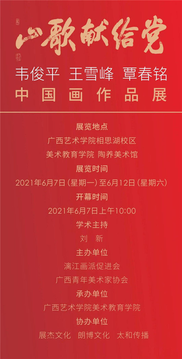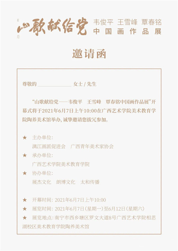 ![]() 深情的山歌献给你 (代序) 广西山多,便有了唱山歌的刘三姐。 广西的山多姿多彩,每一座山就是一首歌。 广西的山入画,便有了许多喜欢画山的人,他们为家乡的山而放声歌唱。 我崇拜山的伟岸和坚强。他从来不向任何恶势力低头,宁愿粉身碎骨,也不卑微屈膝。甚至被剥去了皮肤,露出块块肌肉,他也怒视远方,不放弃斗争的勇气。 雪峰感动于山的大方与无私。山从来都是乐于奉献的,那满山的修竹和高高的树木,那硕果累累的木瓜和芭蕉,是人们生活离不开的宝贵资源。从山上流下来的泉水,在山脚汇集成平静的湖面,那是生命之水,流进千家万户,流进万亩良田。 春铭一定是多愁善感。他醉心于雨后的山,朦胧,妩媚,神秘。当南方的春雨来临,山便把自己隐藏起来,变成远处静静的背影,让木楼变成舞台,让石拱桥上的牧童、老黄牛、小黄狗变成主角,好一幅令人向往的生活美景! 我们对山的热爱发自内心,我们对山的赞美发自肺腑。今天,我们把一首首深情的山歌献给中国共产党,这是儿女对母亲深深的爱恋…… 韦俊平 2021年5月31日于百色右江之畔 参展画家简介及作品欣赏 ![]() 韦俊平,广西都安人,1990年毕业于广西艺术学院美术系。现任广西艺术学院副院长、中国美术家协会理事、广西美术家协会副主席、漓江画派促进会副会长,硕士研究生导师。 ![]() 《都安写生之一》46cm×69cm 2021年 ![]() 《东兰写生之一》46cm×69cm 2021年 ![]() 《凤山写生之一》46cm×69cm 2021年 ![]() 《凤山写生之三》46cm×69cm 2021年 ![]() 《列宁岩》46cm×69cm2021年 ![]() 《新年伊始》46cm×69cm 2021年 ![]() 《桂北春意》52cm×99cm 2020年 参展画家简介及作品欣赏 ![]() 王雪峰,1980年出生于广西灌阳。现为广西艺术学院教授,硕士生导师。中国美术家协会 会员,广西青年美术家协会副主席兼秘书长。漓江画派促进会学术委员会常务理事、广西区党委宣传部签约画家、广西青年联合委员会委员。中央美术学院青年骨干教师访问学者。 ![]() 《满溢出来的夕阳》136cm×68cm 2021年 ![]() 《刚刚诞生的夏天》136cm×68cm 2021年 ![]() 《南山醉月》136cm×68cm 2021年 ![]() 《如梦令》90cm×96cm 2021年 ![]() 《乡路迢迢》68cm×68cm 2021年 ![]() 《孤棹在沧浪 幽幽与世忘》68cm×68cm 2021年 ![]() 《春分》68cm×68cm 2021年 参展画家简介及作品欣赏 ![]() 覃春铭,1977年生于广西钦州。毕业于广西艺术学院山水画专业,获硕士学位,师从黄格胜教授。现任职于广西艺术学院美术教育学院,副教授,漓江画派促进会常务理事,广西青年美术家协会理事,民进广西开明书画院秘书长,《中国书画》杂志社书画院院聘画家。 ![]() 《程阳有雨》69×46cm 2021年 ![]() 《雨润家山》69×46cm 2021年 ![]() 《雾锁侗家》69×46cm 2021年 ![]() 《细雨无声忽有声》69×46cm 2021年 ![]() 《杨柳青青江水平》69×46cm 2021年 ![]() 《春光不闲早》69×46cm 2021年 |