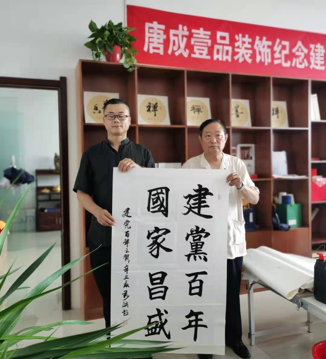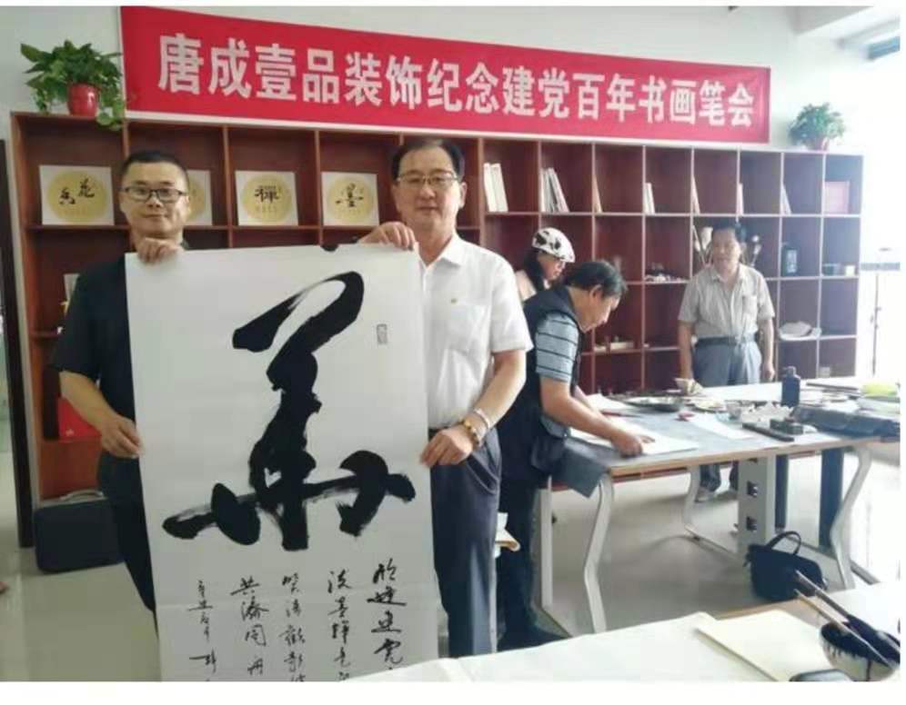 在书画笔会环节,书画名家和唐成壹品装饰的书画爱好者共同参与,现场创作氛围浓厚,大家挥毫泼墨、各展其长,一幅幅书画作品跃然纸上,或苍劲有力,或浑厚凝重,饱含着对党和国家的深厚情感,艺术家们以精彩的书法、绘画作品向党的百年华诞献礼。大家纷纷展示自己的书画技能,娓娓交流,畅所欲言,各抒己见。书法爱好者们将深厚的艺术造诣、精湛的书法技艺与“爱国”“爱党”的正能量主题相结合,借书言志,以笔传情。