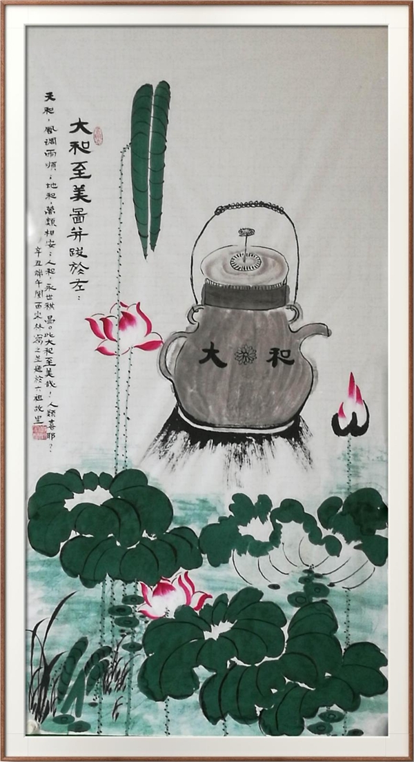 《大和至美图并跋》 天和,风调雨顺;地和,万类相安;人和,永世祺昌。此大和至美哉!人类应为大喜耶?辛丑端午宗林写题于六祖故里。