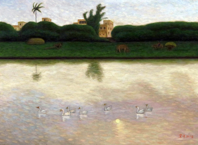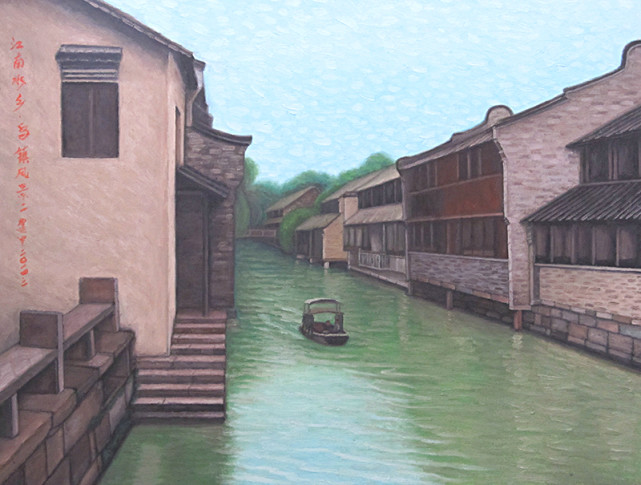 油画《江南水乡-乌镇风景三》(60x40cm) 2011年-油画《喜送新娘》和国画《逆流而上》在文化部中国国际书画艺术研究会主办“复兴之路·当代艺术成就展暨当代中国艺术名家评选活动中”被评为“特别金奖”。 2016年-油画《家乡的小路》《荷花•蛙》和书法《龙腾》作品及简历入选并永久镌刻在八达岭新长城中国文化榜和长期在中国新长城与长城论坛官网展示。荣获“中国长城文化金奖”。 2017年-国画《月是故乡的圆》《春竹闻鸟声》《欢腾的山谷》《卢舍那佛-断恶修善》和两幅书法(草书、隶书)入选“辉煌中国书画交流展”。 2017年-国画《长城内外尽朝晖》入选文化部艺术人才中心主办的“品墨韵中华”全国美术人才作品展并被收藏。