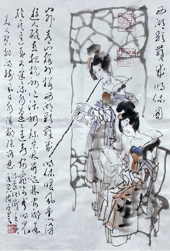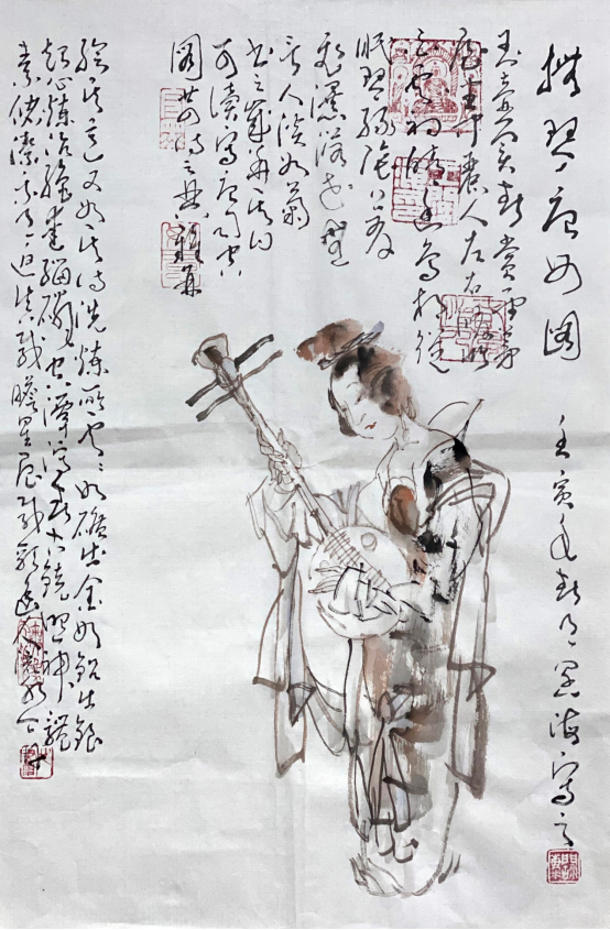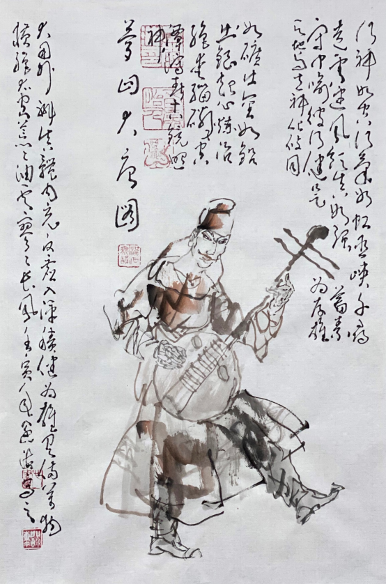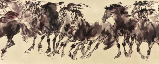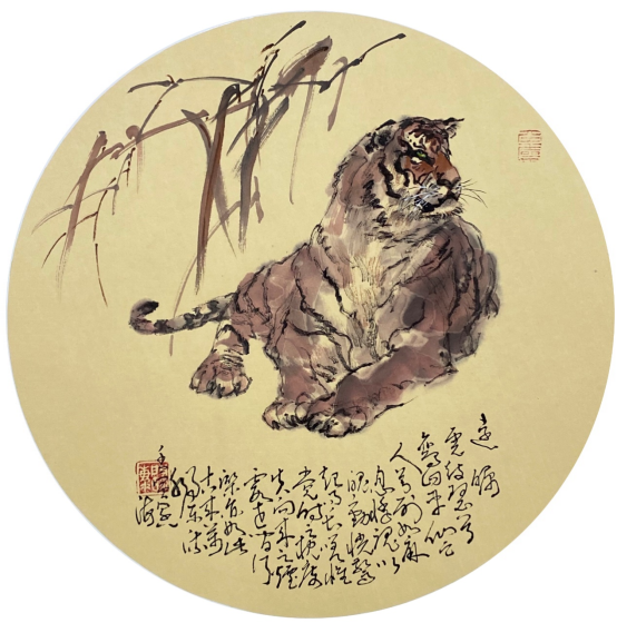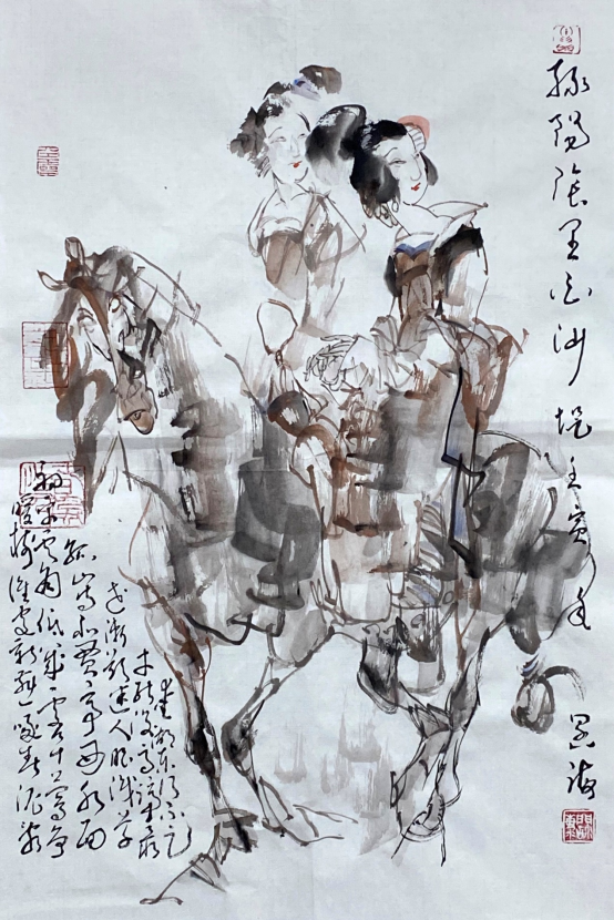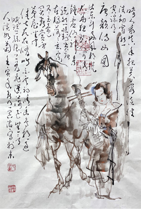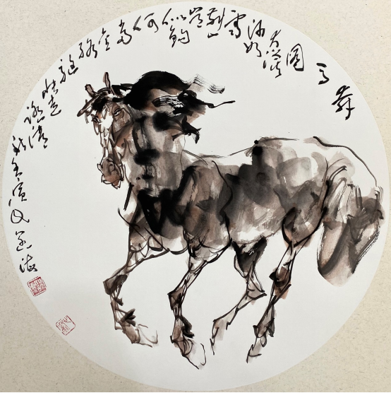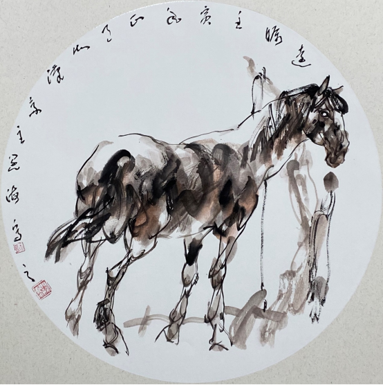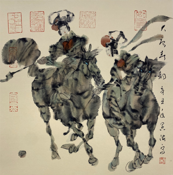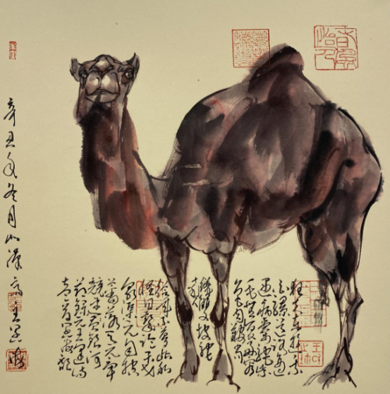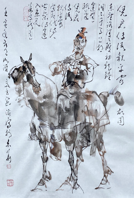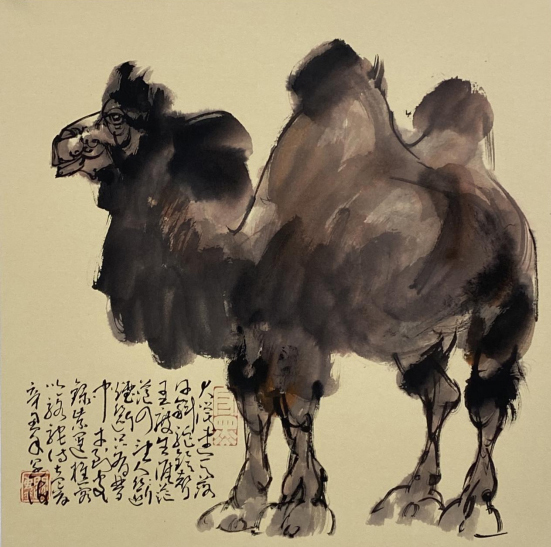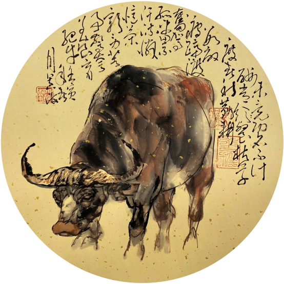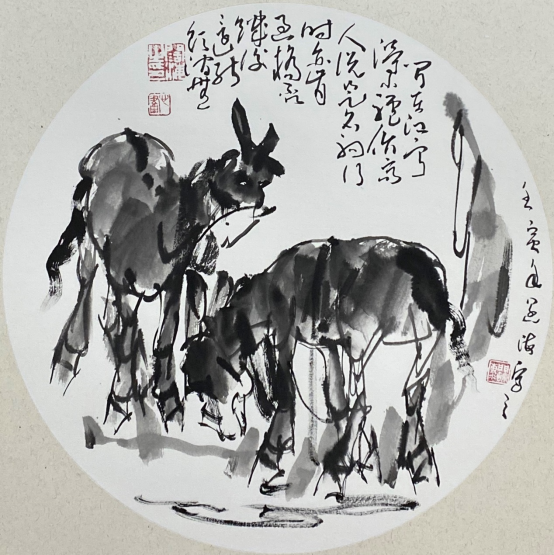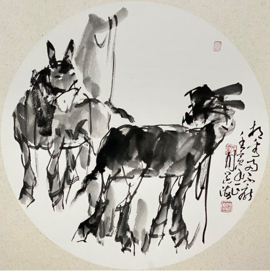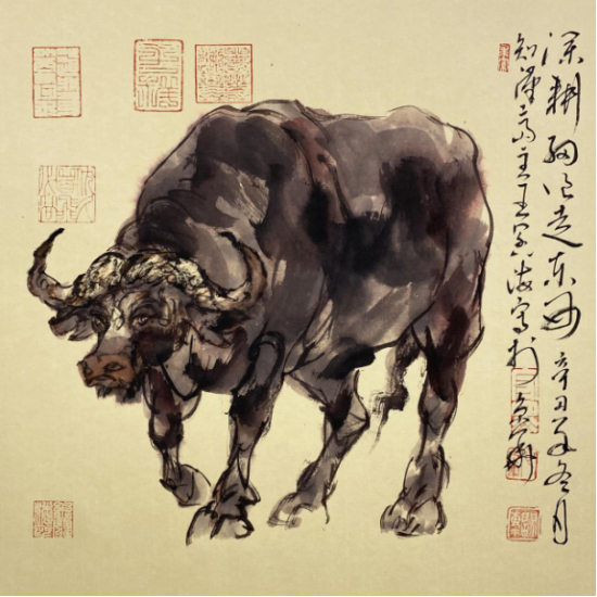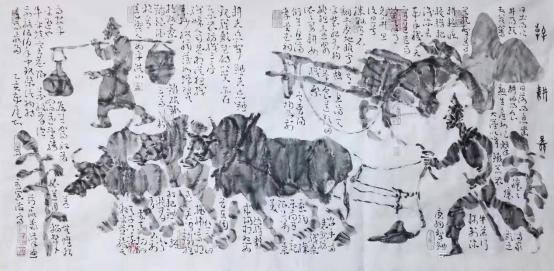 依此理论与中国画笔墨相结合,就会明确线往哪里勾,墨往哪里落,很有可操作性,使我的学生受益匪浅。这些年来我的驴、马、牛、羊、老虎的写意画都是以此理论而画的,对前人有了突破性发展;4.文人画的品质。长期以来我始终坚持文人画诗、书、画、印四者并举的修行路线,来提高我的新汉画艺术品质、品位、品格。从南宋梁楷的《泼墨仙人图》,到八大山人、徐谓、张大千的泼墨没骨画法,来汲取营养。我的新汉画没骨画法既来自于传统、又有新的技法突破。若讲新汉画的创新我是自创一派,但对于恪守文人画的人文品质我又是保守一派。