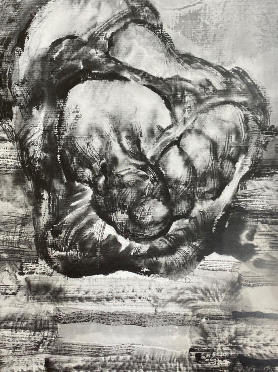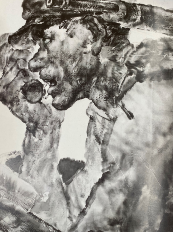 刘:这里面渗透了你的个性,实际上你有很多地方也舍弃了,你把结构线面结合了,再塑造形体,凹凸感就加强了,力度也就加强了。你还解决了一个技术问题,就是墨会跑,那么你是如何定形的? 王:这个很简单的,但是有时候想不到,那么想到了它就容易了,我就在墨跑的最好的时候,我要求定住它,不要再跑了,我突然想起了吹风机,一吹马上定住了,再进行下一层。