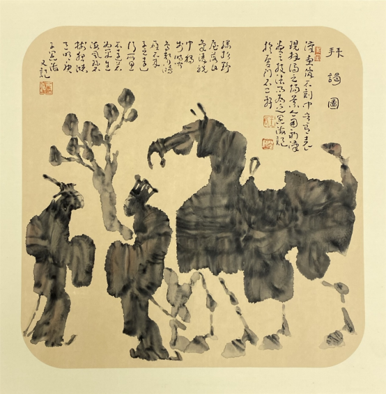 刘:他石涛的东西多一些。八大就是纯墨的东西,单纯的高雅。还有徐渭,你的墨气里面有徐渭的影响。你画的骆驼,你画的马,就有徐渭笔墨的一些精神,乱而不乱,笔墨层次非常微妙,黑白灰能分清黑中之黑,亮中之亮,灰中之灰,墨分十色是可以做到的。“哆来咪发索拉西”都有了。同时你掌握了冲墨,冲的过程当中如何有度,这个度你把握得非常之好!再加上你的诗文与书法提高了你所独创的新汉画的品味,可以说明清文人画的笔墨精神在你这里得到了延续,成为极少数的承薪接火之人。