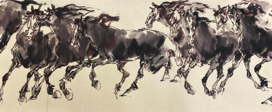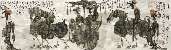 开始研究我的艺术触角,我到底要往哪个方向,此时我看到汉画像石刻非常震撼。再一个提到李存葆,他给我看了一个人家送给他的武梁祠的车马出行图,然后他裱起来让我看,对我触动也非常大,因为我过去看到的都是印刷品,那么看这个原拓给我触动很大,太现代了,这个马上还有马,人上还有人的平面构成,很浪漫,大汉民族的文化精神展现得一览无余,真是博大的、阳刚的、雄浑的、外放的、那种现代派的,使我眼睛一亮,如果说能把这个转换成现代水墨,把石刻形态转换成水墨形态,这个在中国美术史上是没有的,是前无古人的。我当时很激动,眼睛为之一亮。我还看了南阳的汉画像石刻的印刷品,有个骑射田猎图,也许是石头破损的模糊,也可能照相模糊,也可能印刷模糊,跟笔墨在那流动似的,恍惚间我看出一种笔墨的流韵,如果把这个转化成流动的现代水墨不得了。