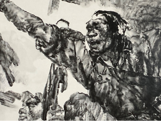 刘:这就是你运用水的效果浓淡枯湿的变化。这几点抓住以后,你把原来在石头上的汉画像石把它活化了,把古汉画激活了。古代题材都是汉画像石的题材,那么到了当代这种新历史绘画的时期,你对汉画像石的营养怎么用进去?怎样和素描结合? 王:我研究西方素描以后,我又研究中国画素描,就是为中国画笔墨服务的素描该怎么画?我在清华大学教学,第一个课就是中国画素描课。我提出了四要素,“以线为主,明确结构,线面结合,塑造形体”,这就是直奔形体结构的中国画素描,它讲究计白当黑的空白运用和丰富的笔墨色彩变化,而排除光影的一切干扰。