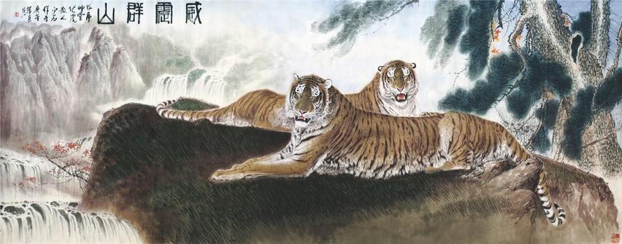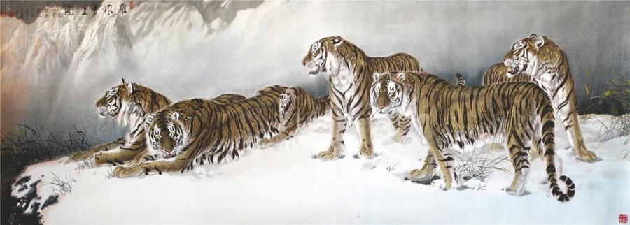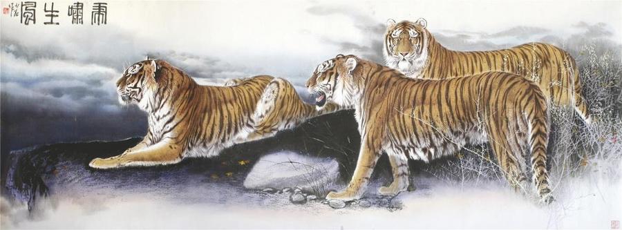 《雄风图》 值得一提的是,张少石曾历时数年精心创作出扛鼎力作——《百虎图》。在30余米的长卷中,一百只老虎情态各异,扑、咬、跳、卧、走、奔、惊、喜、怒、啸……无论老幼雌雄,个个神丰韵足、栩栩如生,鲜活威猛之势直逼画外,使观者仿佛置身于虎林之中。作品充分体现出画家敏锐的观察力和高超的艺术表现力,被画坛誉为“虎中神品”。著名国画大师娄师白先生阅后喜不自禁,在《百虎图》的边款上题赞曰:“少石仁弟,画虎有其特点,能自成风格,构图严谨,生动有趣,可誉以虎王之称。”自此,“虎王”之称誉不胫而走。