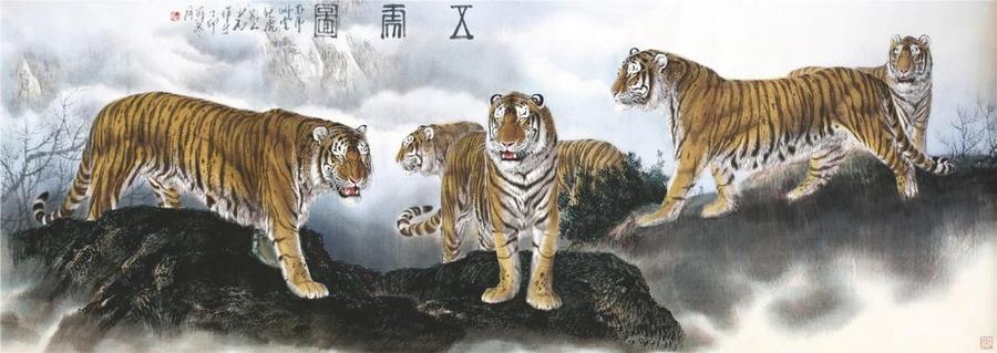 《五虎图》 张少石笃信禅学,常问道于高僧大德,探寻禅法深意,并在家中设有参禅礼佛的禅房。禅宗美学思想对他的审美观念与创作实践产生了重要影响,他“笔中有禅,墨中有禅,禅在笔先,直指本心”,观其画如置身于清凉佛境。他以一颗修禅之心通过细致的观察和研究发现:虎处于食物链的最顶端,没有天敌,又是独居动物,而且胆大心细,机警无比,绝不贸然行动,虎的天性就具有禅性。故而张少石笔下之虎全然不见暴戾恣雎、穷凶极恶,而是澹静自持、不怒自威,于沉雄静穆中寓傲然勃发之气,一副“不取于相,如如不动”的世尊佛陀般的庄严妙相。表现出“不管风吹浪打,胜似闲庭信步”的沉着淡定与安闲自适,别具禅的虚静境界和超脱精神。