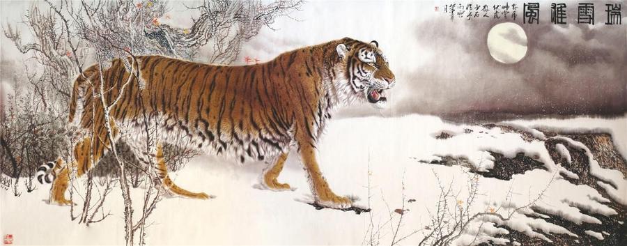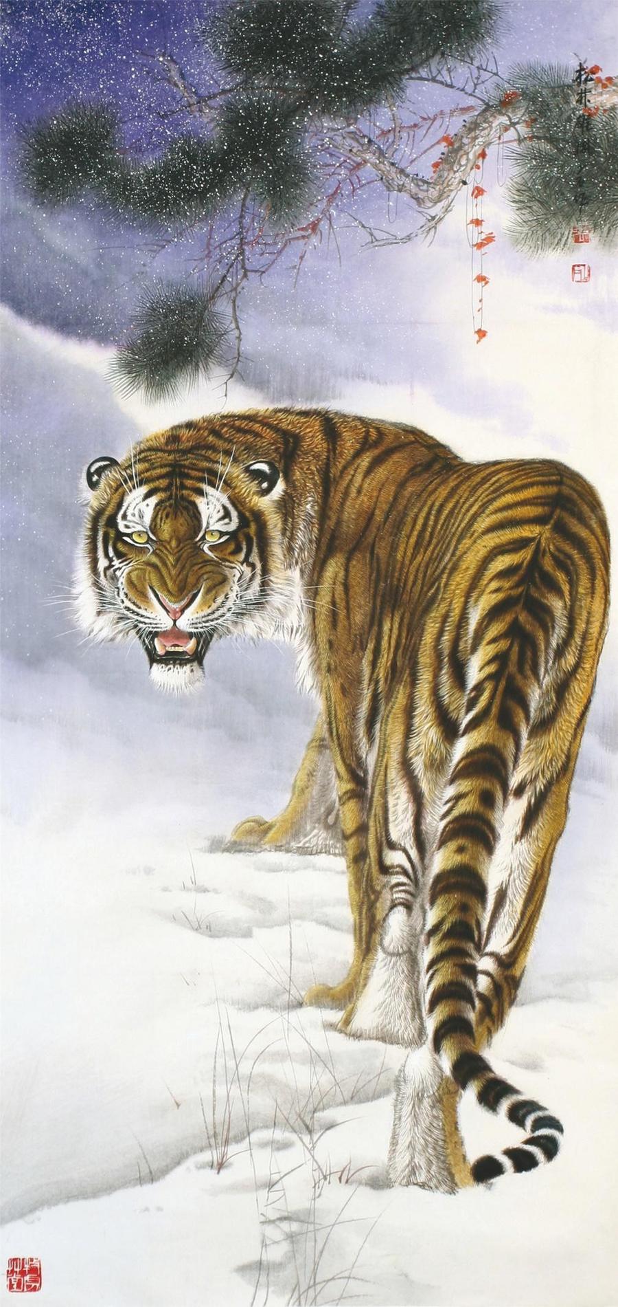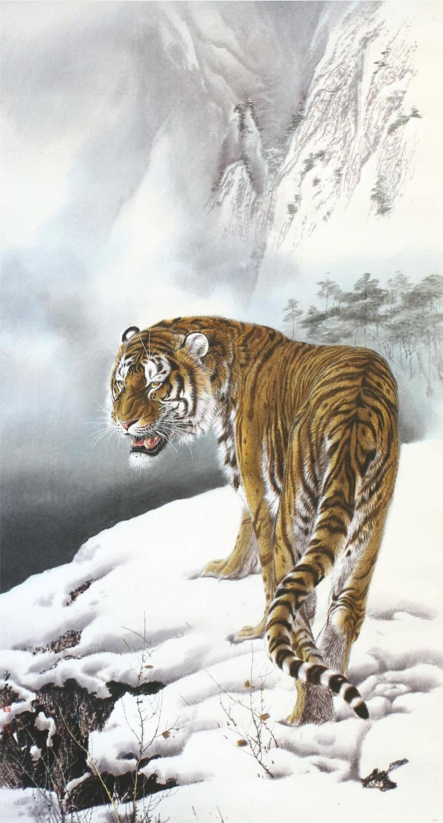 《雄风》 庄子曰:“澹然无极而众美从之”。张少石多借助大写意技法,用笔、用墨与用水并重,对画作背景做极其简约的处理,营造出玉宇澄清的高洁氛围,烘托出“静故了群动,空故纳万境”的幽玄禅境。白雪皑皑、苍茫萧索的深林雪野与老虎孤高傲岸的秉性构成了和谐完美的统一,深蕴远离尘嚣、宁静致远之美。