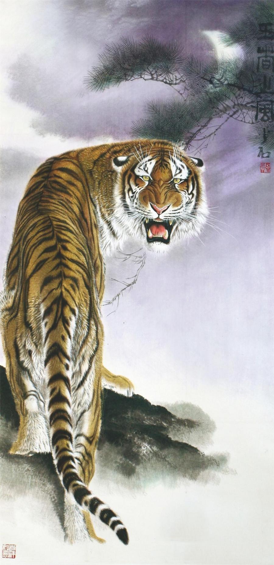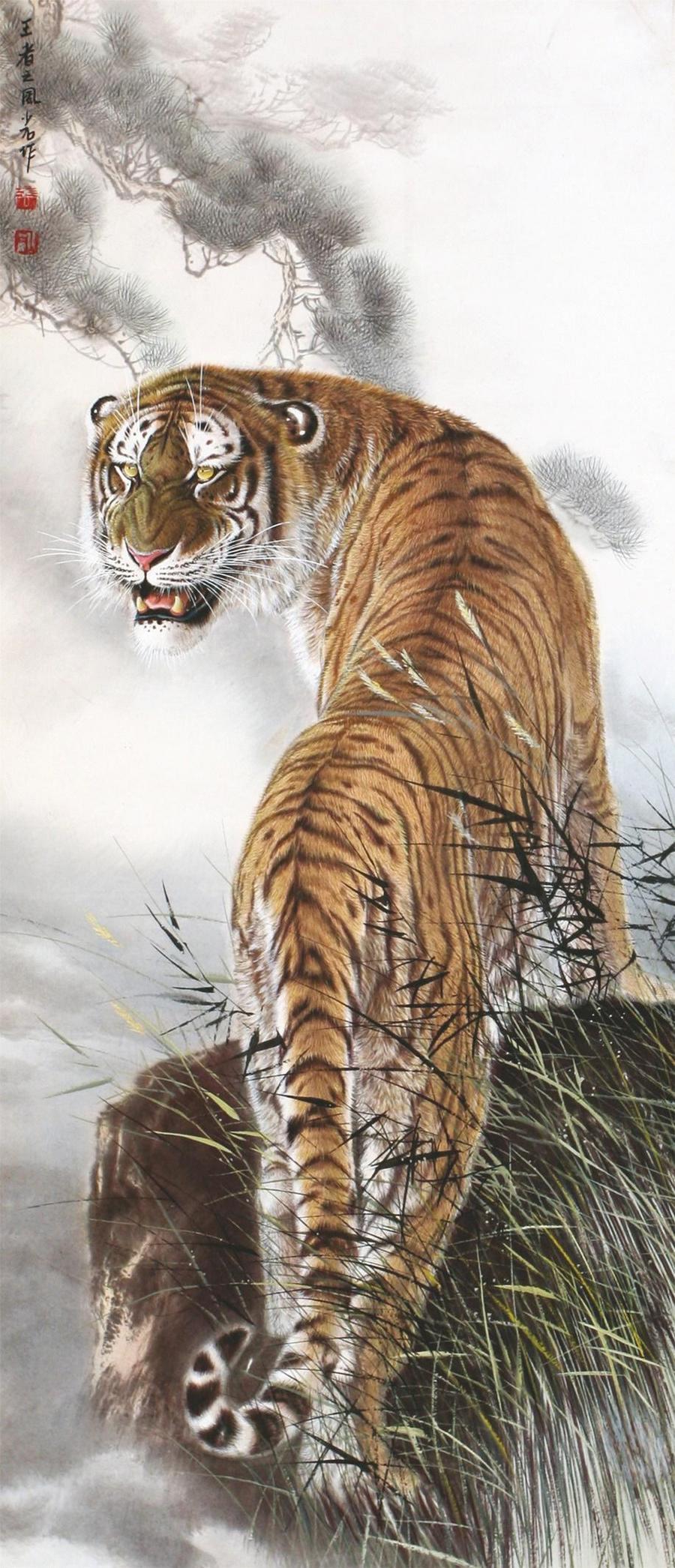 《雄风万里图》 虎历来被奉为驱逐邪恶、趋吉避凶的神兽。张少石笔下之虎极具“百兽之王”的傲骨雄风,兼有佛家之庄严慈悲、儒家之敦厚仁和、道家之仙风道骨。妙明真心,圆照万物,昭示出一种王者至尊的大气派,大智慧,大自在。悬之于高堂,顿觉风气泰然。观之则心定神安,百虑皆除。