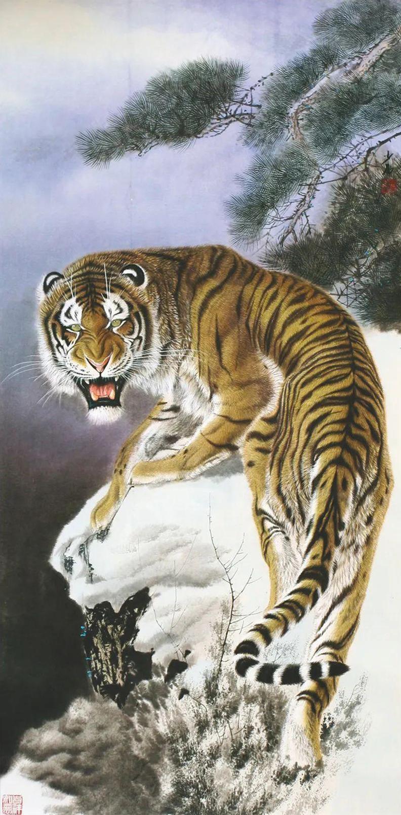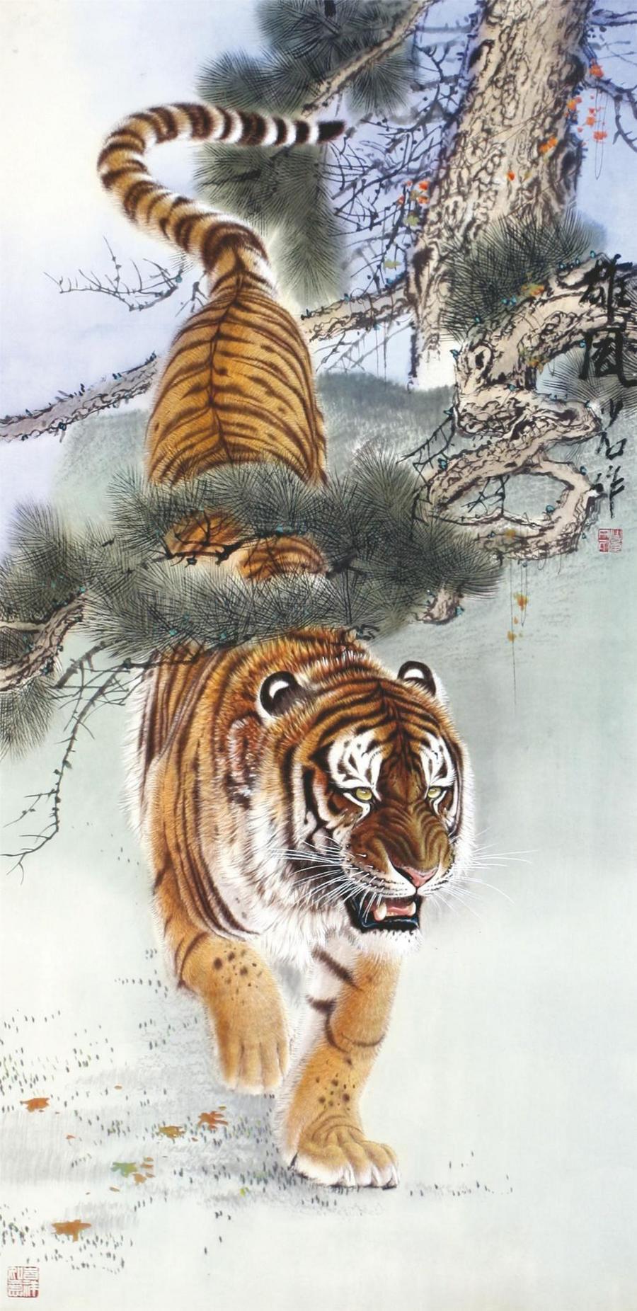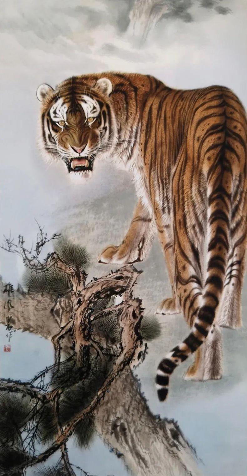 《虎啸生风》 张少石笔底之虎,造型语言呈自然和谐、浑然天成之韵致,充分体现出虎的原生态魅力。张少石对虎的习性、形态、动作、神态、肌肉、骨骼,甚至斑纹的走向及变化规律都了然于胸,以中西合壁、熔古铸今的技法表现出虎健美匀称的体形、重量感、质感及光泽感等。工整严谨,精细逼真,纤毫毕现,对头部特别是虎眼的刻画尤其精微。同时又注重虎的整体形貌与气韵,避免了“谨毛失貌”。画中之虎呈博大轩昂之姿、气定神闲之态,由内而外透射出一种巨大的威慑力,令人不寒而栗,毛骨悚然。