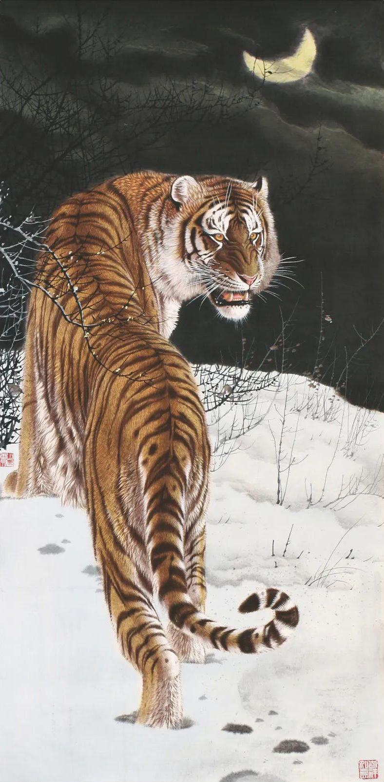 《傲视苍穹》 “画虎画皮难画骨”的说法自古有之。得虎之骨气难,得虎之神魂更是难上加难。这除了要求画家具备千锤百炼的过硬技法,生命体验非常关键。为什么有人画出的虎外形惟妙惟肖,却显得僵硬刻板,如同毫无生命力的动物标本?或者是虎性尽失,浑似娇憨可掬的毛绒玩偶?亦或是摆出种种凶猛的骇人姿态,却让人想到舞台上虚张声势的花架子?其中的重要原因就是缺乏生命体验。张少石曾在大西北戍边三年,广袤的沙漠戈壁、纯净的雪域冰川铸就了他刚毅果敢、豪迈旷达的性格。张少石创作出的虎无不从骨子里映射出军人的凛凛雄风和浩然正气,与虎的风神气度深度契合,极具撼人心魄的精神力量。