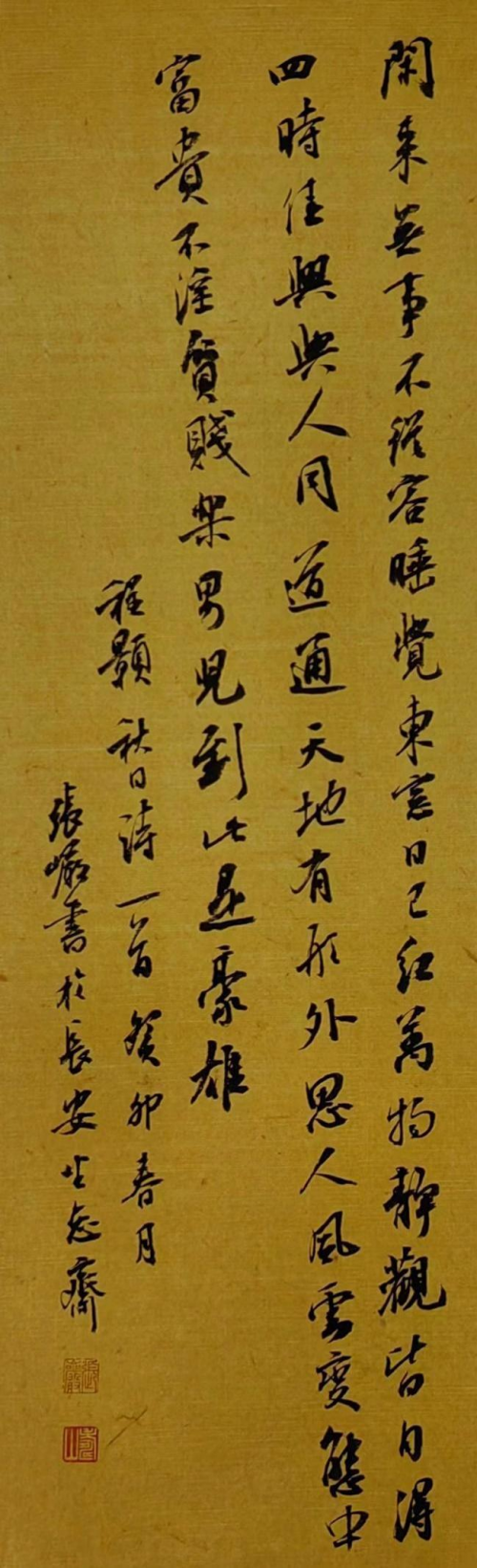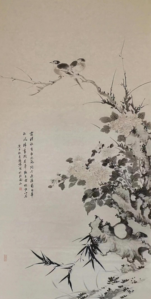 由此而下,进入元代、明、清经典绘画。通过几个来回往复,张岩对于中国绘画经典作品的审美精神已经有了深刻的体会。表现在绘画作品上,如《见静境天真》(138*40cm 2007年)、《灵鸟飞来站好枝》(130*40cm 2007年)、《万和松涛裹泉声》(200*80cm 2009年)等一些列作品,画面上除了严谨的法度和技巧外,还充满了诗歌的优美意境。可以说,他抓住了中国绘画的美学精神和审美本质,无论是山水画,还是花鸟画,如果是缺乏诗意的,那绘画就无异于图案了。 对于经典绘画的研究和品读,逐渐确立了他自己特有的中国绘画美学的审美体系,这个体系指导着他的创作,因此我们审视张岩的绘画,他的变化不是盲目的,而是在这个体系化的指导下进行的。