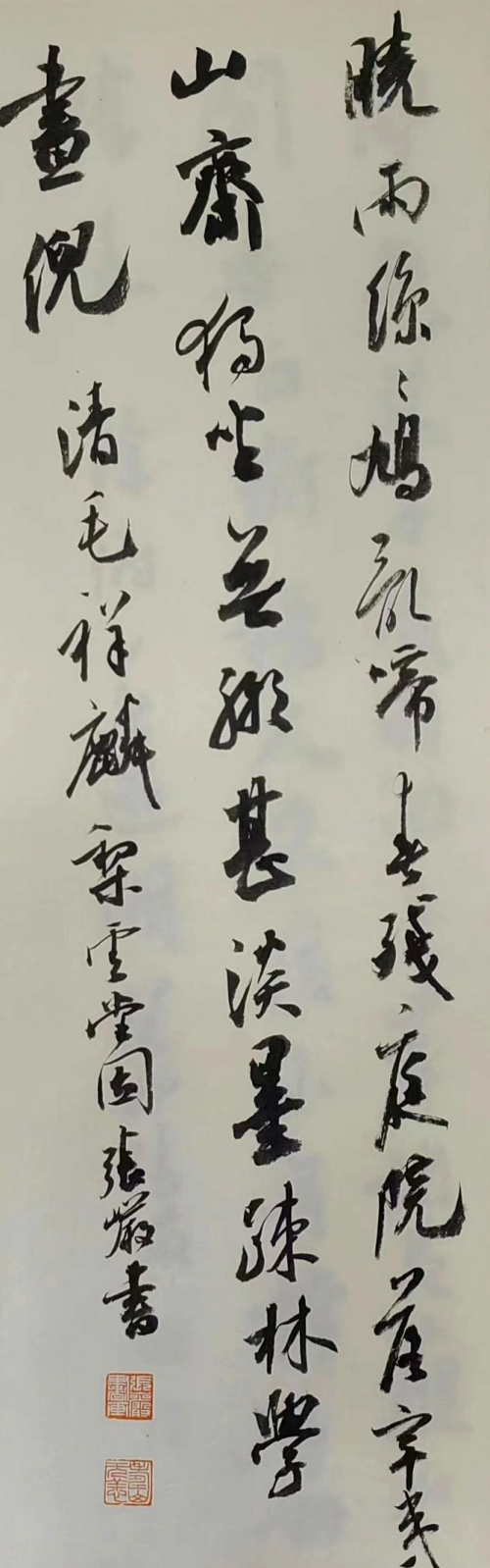 修身为一切艺术造诣之本。身不正者,不足以谈艺术之事。书法有抑扬顿挫,人性有温热寒凉,书法的律动和人类的情感变化是一致的。人们对书法艺术的尊重很容易转嫁在书法家的身上。在民风淳朴的单父故里,张岩伴随着他的书法艺术一起成长。张岩的绘画取法于帖学,在行云流水的基础上得敦厚精美的沉着。这也暗合张岩为人处世的品行。悟性和聪颖是张岩绘画艺术的物理性因素,对于书法艺术的修炼正果则是他绘画艺术的化学性因素。他的书法线条是他绘画中最富有诗意的因素。
