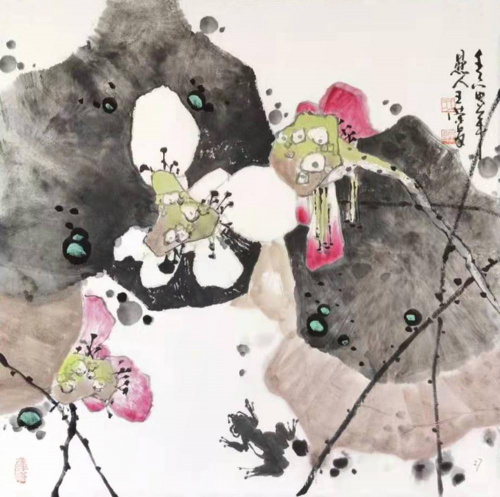 荣昌老师告诉我,这幅作品是他超凡脱俗的创新之作,化境入境,化神入境,化境入神,以清纯与高远,简约与禅缘相结合的诗意般存在。荷的世界丰富多彩,莲子、花瓣、水草都有内在的生命气质与个性,蕴含着自然而然的超越梦幻的旷邈之美。通过各种各样的形态变化,体现了画家内心强烈的意念和炽热的情感融铸,表现了内敛含蓄的美与繁茂浓郁、干净无暇的生命气息。莲花的红,有如女性的唇红,静谧里有一种淡然而又充满爱意的韵味。剥开隐秘的莲子用印象派的技巧,让其变形后有无数双眼晴闪烁,充满了无限生机与个性魅力。使我想起了莫奈的《四季睡莲》,构图、布局、形态、韵律以及所展现的宁静、温馨秘境,虽不相同,但各具特色,其表现生命的共情共性存在的意义与价值之内涵是一致的。业内专家对这幅作品给予了高度评价:“突破历史,突破当下。”