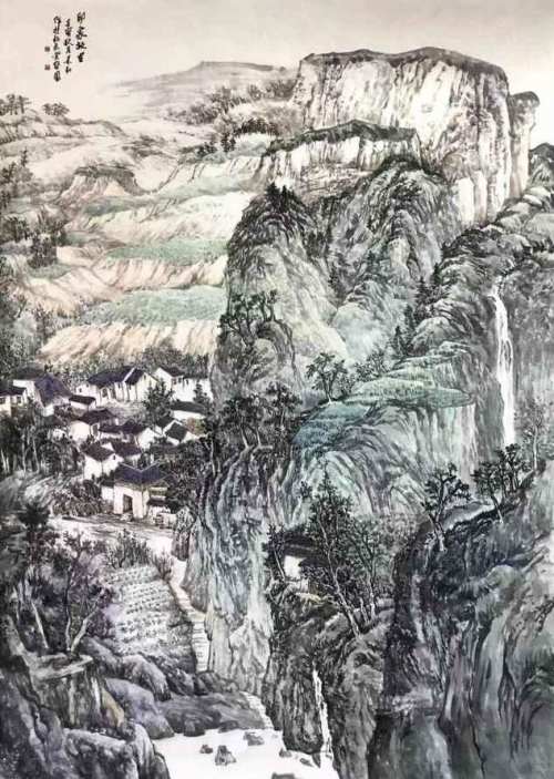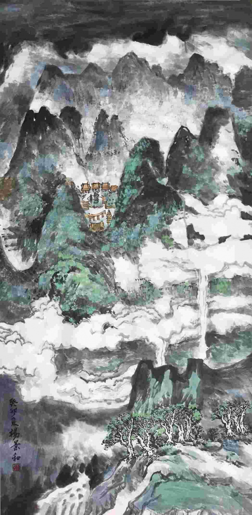 奇幻山水代表作《爱心瀑布》《都安世外桃源》不仅展现了杨景和对传统文化的敬畏和热爱,也展示了他对现代艺术的探索和追求。奇幻山水的可贵品质,还在于并不是远离现实生活的阳春白雪,而是在奇思幻想山水画里承载下许多文化价值和社会责任。他不断通过自己的作品,传达出人与自然和谐相处的理念,全力弘扬中华文化,推动文化传承与创新。这就让他的作品不仅具有艺术价值,更具有社会意义和责任。例如,他的作品《亭亭双浮图》中,通过描绘自然环境的文化传承的关系,引导人们的目光聚焦于文化图腾,传达出文化寻根意识,这也是杨景和山水画的重要特点和价值所在。