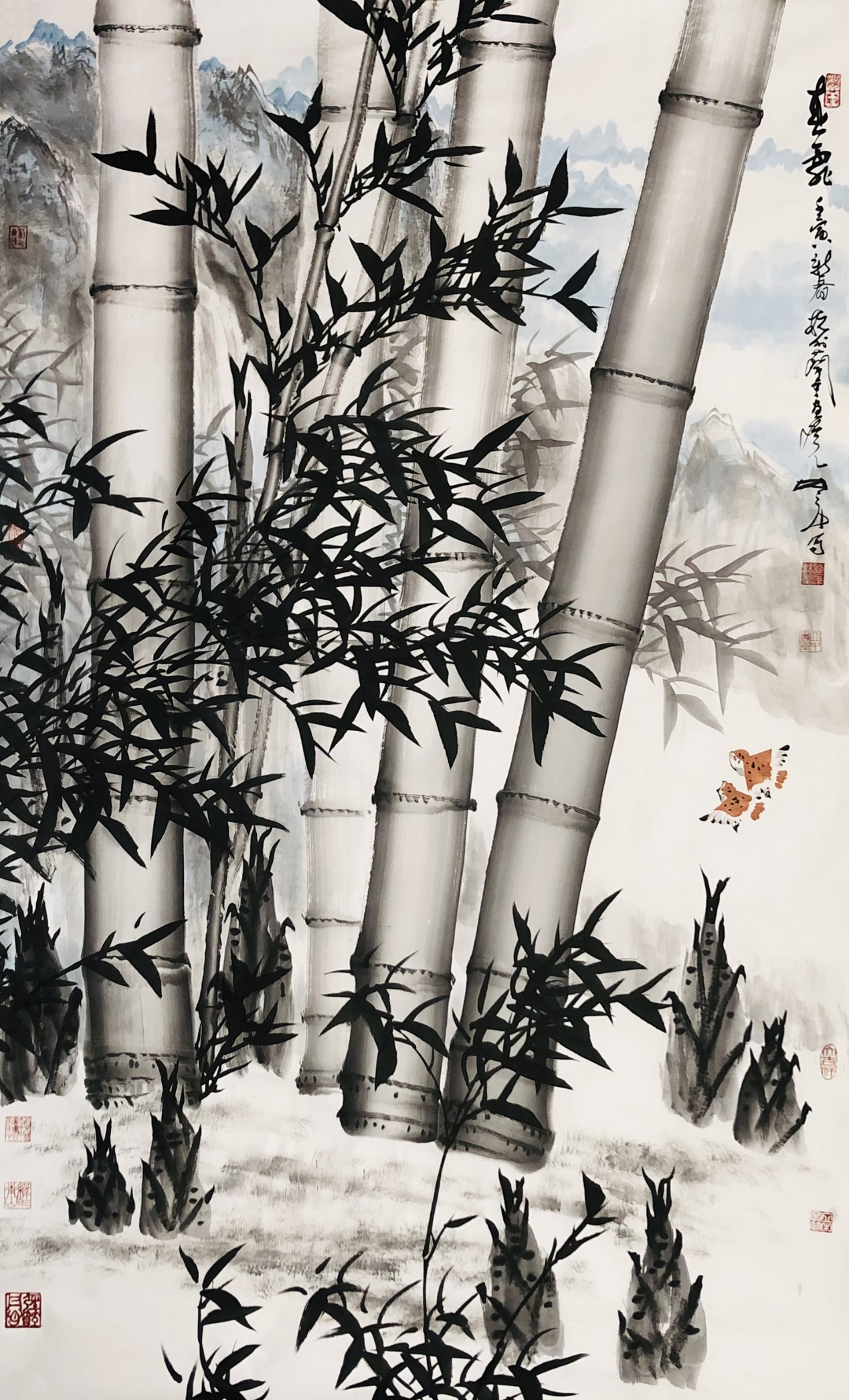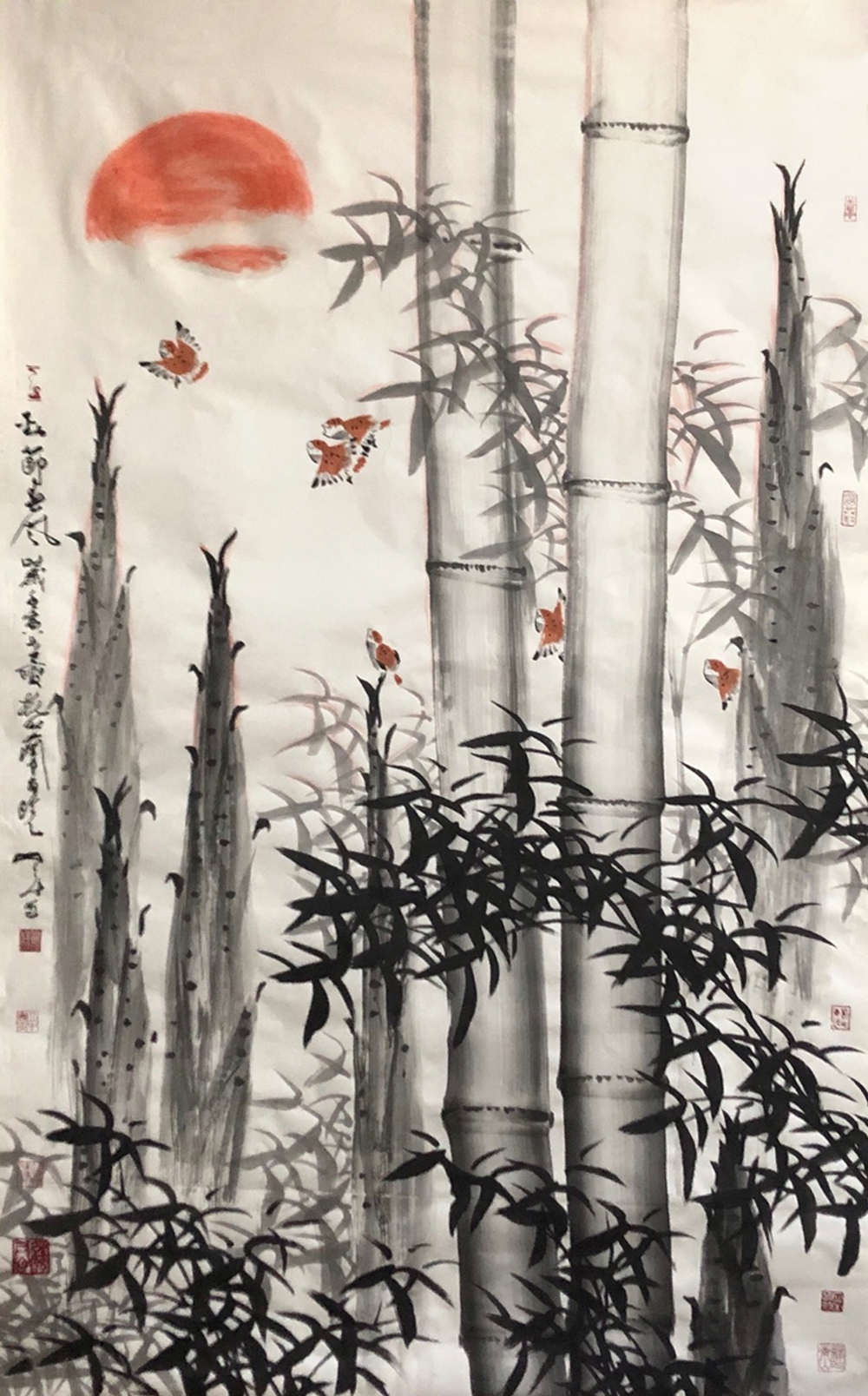 四、走出大山 林立中的国画,师法自然,广揉国内外名家风格与技法于笔端,大胆泼墨,勇于创新,意境隽永,不落旧套。林立中更善于画竹,他删繁就简,疏密相间,浓淡相宜,颖妙成趣。有时看似寥寥数笔,却又竹影横生,妩媚婆娑。他画的竹虚怀向上,清新典雅,丹青天成,有新时期的中华气象,谓“盛世中华竹”。 他画山水、花鸟,有时酒酣性至,信笔涂来,不受拘束。或书或画,篆笔中锋,笔墨苍劲,龙走蛇游,一气呵成。林立中的画得益于书法功底、文学修养,他的书体多变,行草隶篆兼融。干笔如秋风枯树,湿润含春雨带露,既有现代书法的豪放、不拘,又有传统笔意在扎实、章法。