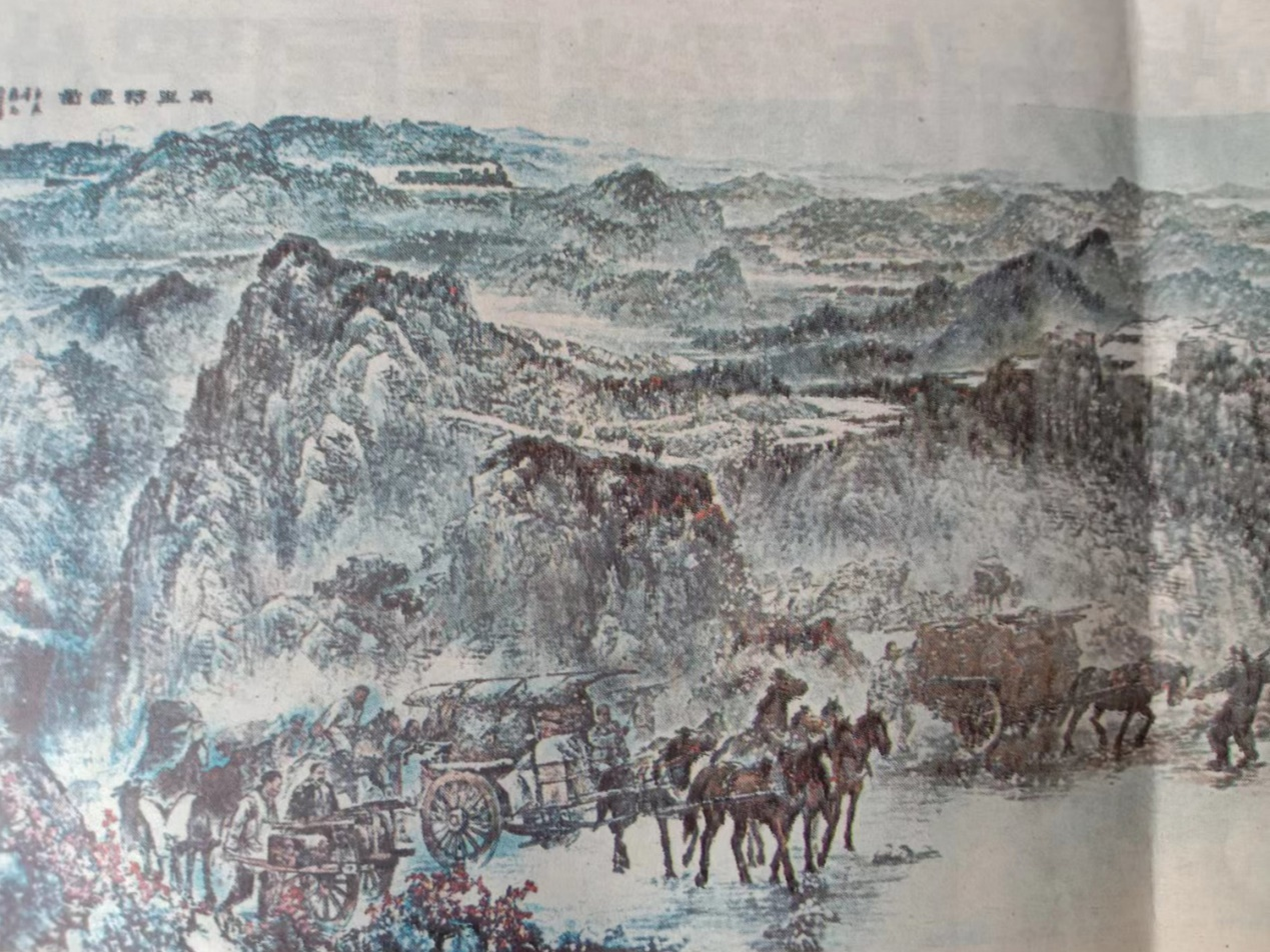 《转运图》颇具匠心,通过从天津港繁忙的装卸,华北大平原上满载的列车,阴雨泥宁豫陕道上艰难前行的人力兽力车队,层层递进,将大转运的重头戏推向了画幅的最显眼处:这是自西安至兰州的六盘山区,坡道崎岖,大雪飘乱、驷马赳赳,肩夫咻咻,高车重载,咫尺千钧。画家运足笔气、墨气、色气,营造气势、气度、气机,总揽浩然大气于画幅,生生不穷,风动云涌。那股陇人特有的气质和神韵油然而生,感染着画卷前久立的每一位读者。