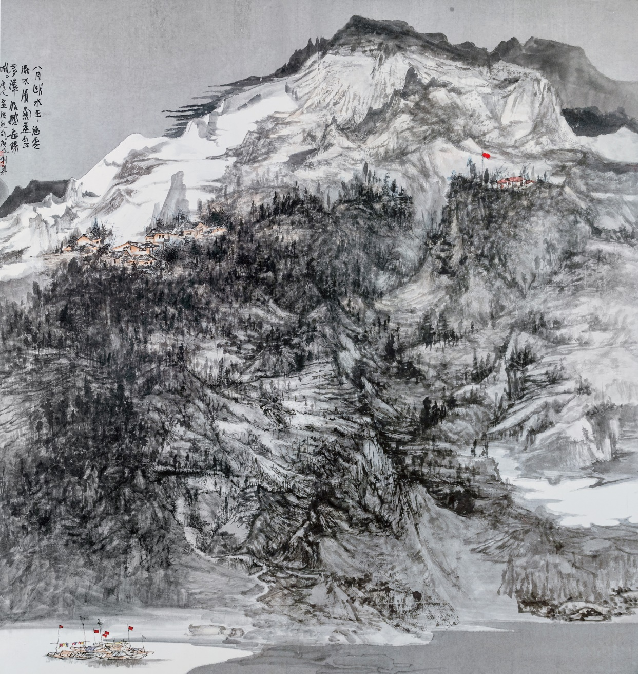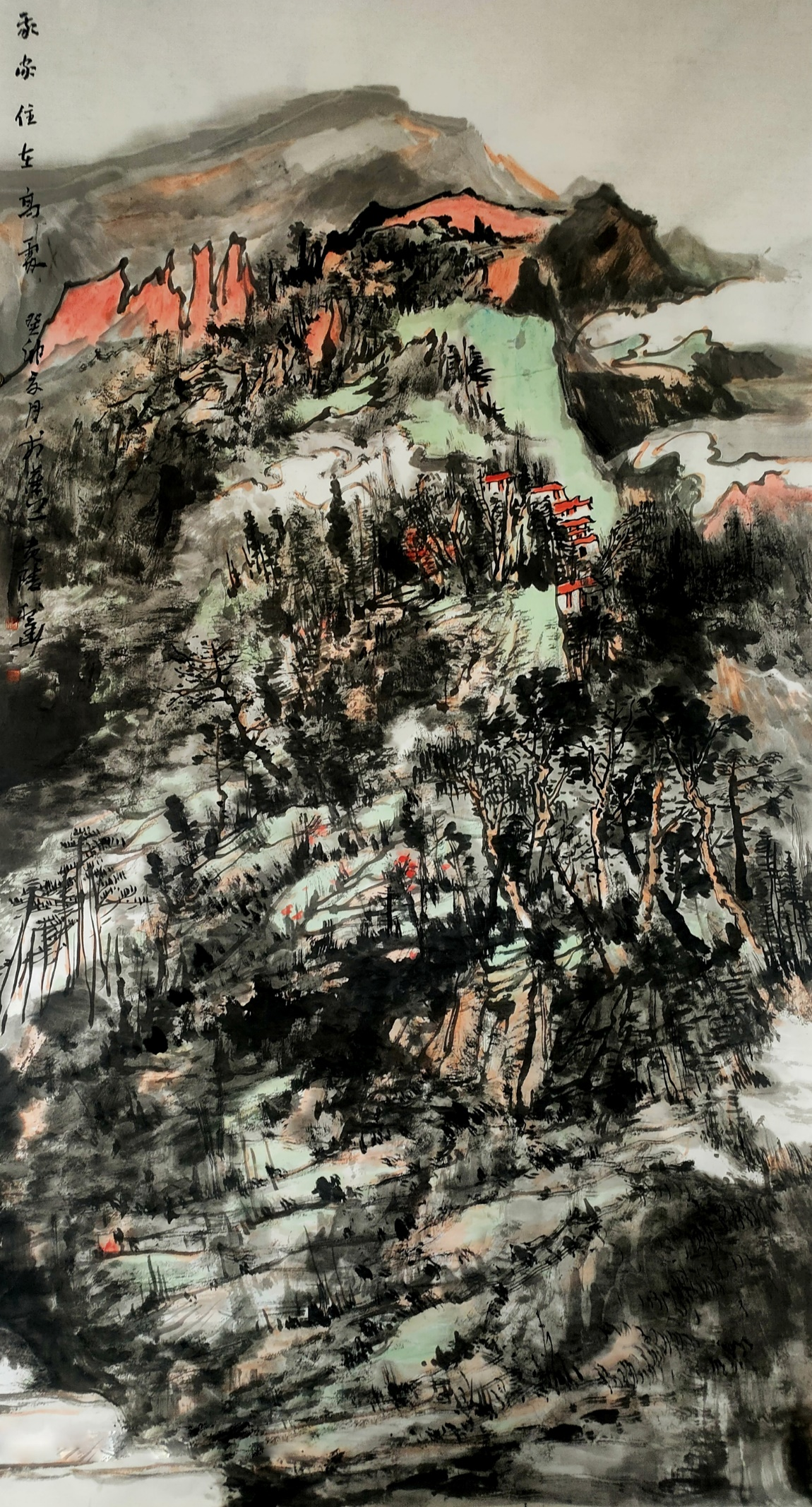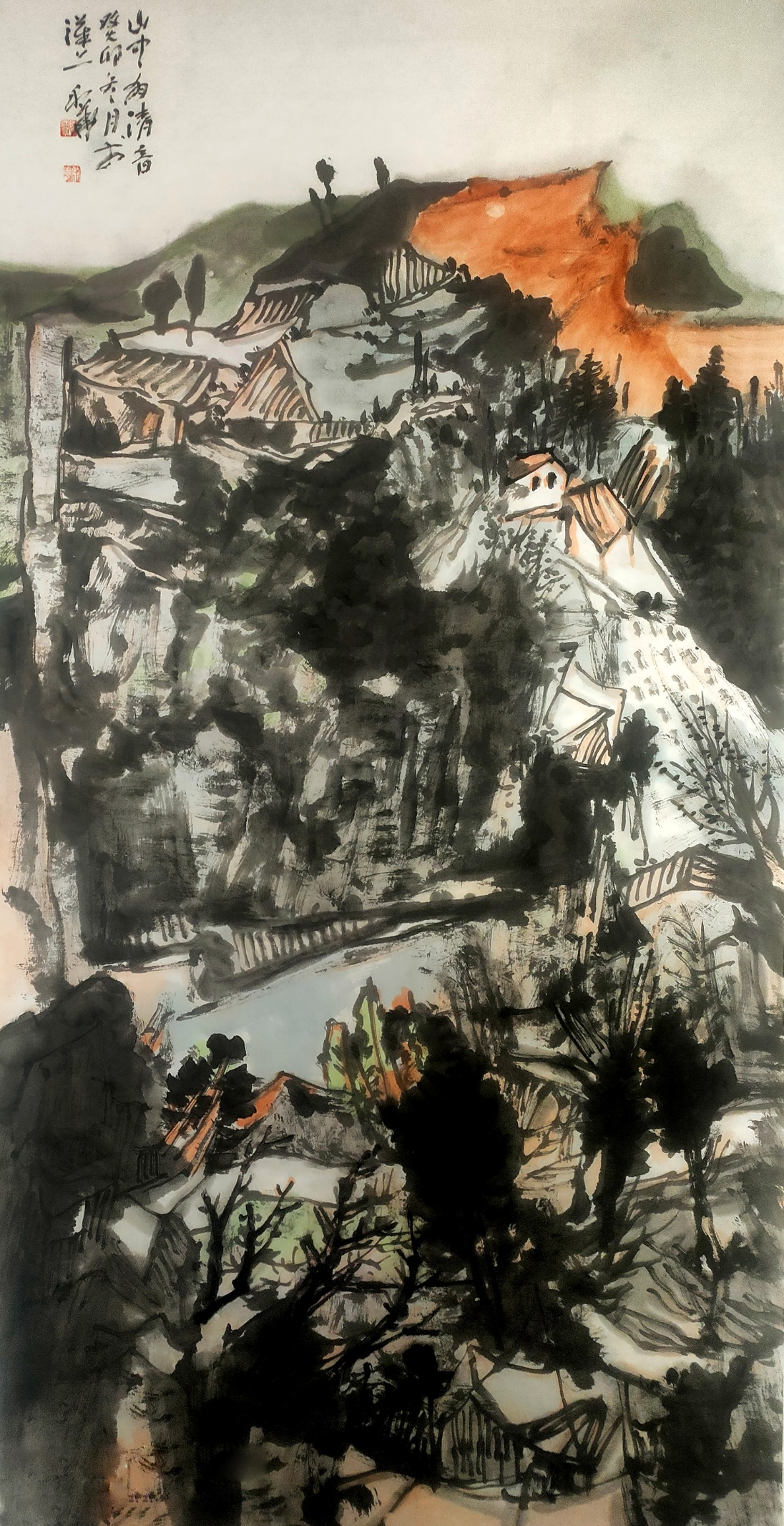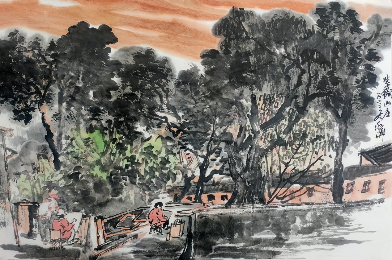 最为得意的妙招是,城在山中,房在城中,树在巷中。山因水而活,城因树而绿。绿色的生态城,为观者塑造了一个充满生机的梦境。细心的人还会发现,他笔下的树木与山石的披麻皴与折带皴融为一体,很难分辨出谁是树木谁是山石。其实,读画读出似是而非的感觉,这才是画家让你产生一种高级的审美意趣,无疑会产生共鸣,享受快乐的美感。利华画画是玩墨高手,传递文人画的正大气象,其当下盛行俗不可耐的市场画,根本无可比拟。他又是创新大伽。在构图上,大胆引用油画的块面与色彩,让画面新颖夺目,以致赋色上一改“黑利华”之旧风,高洁的鹅黄,高雅的石绿,高贵的浅黑,以文人画之浅洚淡雅写之,画面清趣呼之欲出。