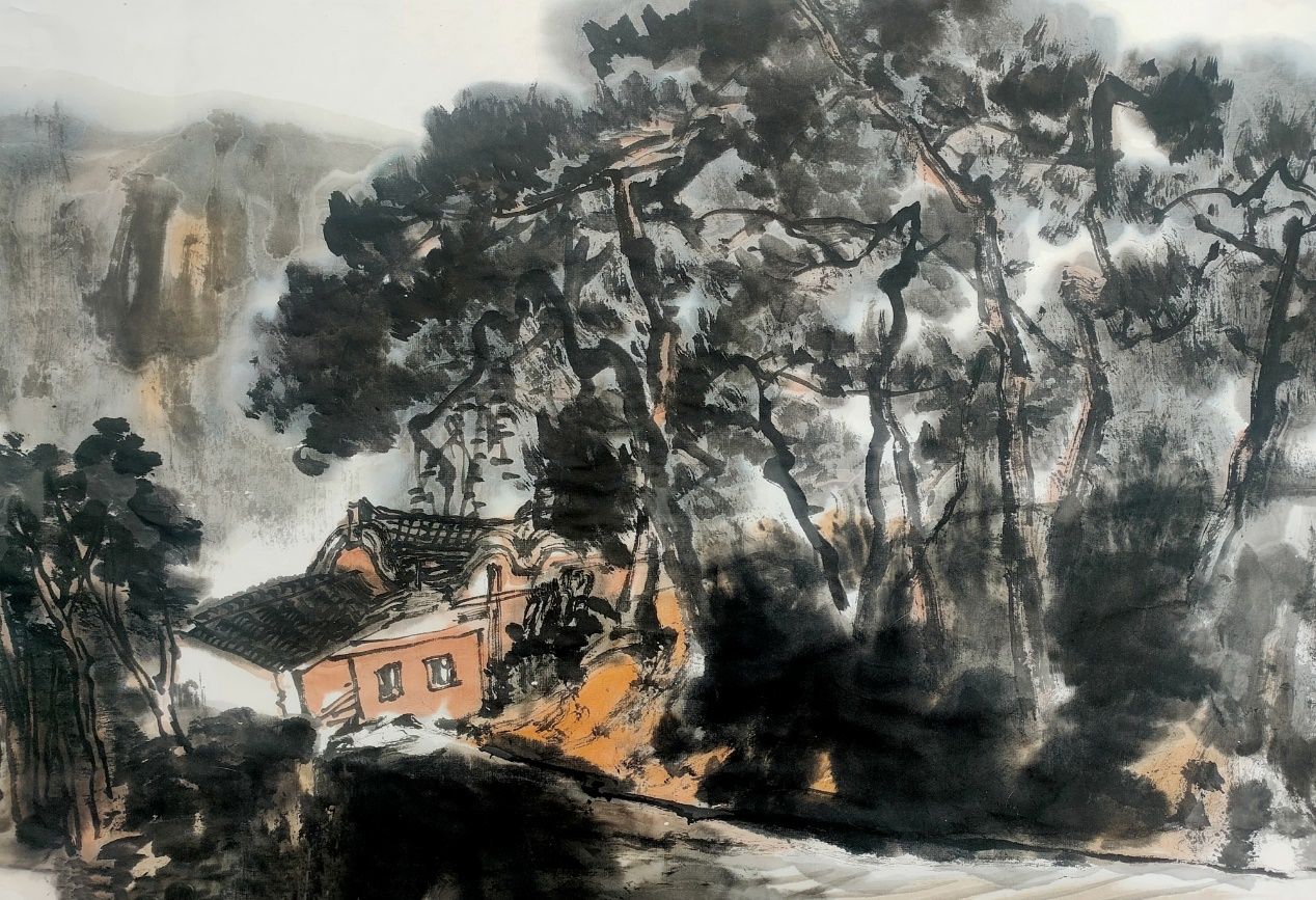 《我家住农村》240×136cm 2021年 此时,观者眼中之线呈规则性逐渐显现,线中线,线上线,线里线,线压线,线穿线,线线相绕,线写春秋。笔墨画出的线,依托水的滋润韵味实足,先前画的线渐渐风干,后来添加的线与干透的线撞击,会生发出新的墨迹,新线与旧线咬合,渗透出新的肌理,待新线渐渐快风干介于次新线时,他又一次再行添加熟墨线条,模七竖八的线或轻或重,此时画面又惊变成全新的韵姿,线里线、墨上墨、水压水的多次甚至N次挥洒后,墨意缤纷,率真呈现,新与旧的交织,浓与淡的渗透,墨与水的撞击,此时此刻产生的墨韵甚是奇骏,甚是唯美,甚至不可复制。