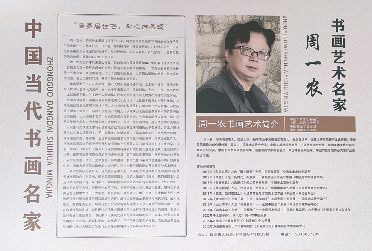 【艺术简历】 周一农,湖南湘潭市人,现居北京。86年毕业于湖南省工艺美大,先后就读于中国艺术研究院研究生课程班、清华美院理论与创作研修班,现为:中国美术家协会会员,中国工笔画学会会员,中国壁画学会会员,中国美术家协会藏书票研究会会员,中国艺术书画家协会理事,湖南省美术家协会会员。中国禅林画院画家。中国文化管理协会文化产业委员会专家。 作品主要参展情况 2019年《和谐家园》入选“雨花满天”全国中国画作品展(中国美术家协会举办) 2019年《晴雪》入选“新时代,新意象——首届全国山水画双年展(中国美术家协会举办) 2018年《侗寨欢歌》入选厦门全国工笔画双年展(中国美术家协会举办) 2018年《故园雪韵》入选“汉唐风韵,水墨长安”全国中国画作品展(中国美术家协会举办) 2018年《回家,我们在路上》入选第四届哈尔滨美术双年展(中国美术家协会举办) 2017年《碧山翠谷》入选“黑山白水,美丽四平”首届全国中国画展(中国美术家协会举办) 2016年《山乡春早》入选“翰墨青州”——全国中国画作品展(中国美术家协会举办) 2016年《瑞雪丰年》入选“中国精神”2016——中国百家金陵(中国画)作品展,入会资格(中国美术家协会举办) 2022年于北京文衍美术馆举办“大家风范”周一农中国画展 2015年在北京798举办题为《心即是佛》个人画展。 2012年为湖南南岳衡山广济禅寺创作《五百罗汉图》并雕刻在大雄宝殿大门。 ![]() ![]()