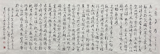 艺术继承难,创新尤难。王阔海以高标独举之创新精神而饮誉于时,其新汉画以壮阔之意境、飞动之体势、古雅之格调而新人耳目,震人心魄。 阔海之书能整体推进,潜心研习,各体皆能,以楷、行、隶、草、简为最,多蕴先秦英气、汉魏风骨、晋唐气象、宋元格调。观其所作,字态饱满,意象丰润,气息贯通。 阔海之真楷颇见功力,读其《文心雕龙·知音》《序志》等长卷立轴,刚健婀娜,萧散俊朗,清宁澹远,禅意盎然,盖知基高台厚、真气内敛也。 阔海心契老庄清静无为之道,心游姑射,思出物表,挥翰超尘,离笺入俗,能入能出,与天地参。至若点画挑钩之到位,撇捺横竖之往返,结字态势之奇正,聚散松紧之浑成,以期尽入道解。无逞强霸悍之姿,无矫揉造作之态,慷慨以任气,磊落以使才,振笔直遂,烟云满纸。 阔海丰情多才,精思善悟,精于画,耽于诗,妙于书,观其所作,书画交融,其楷隶与高华淡远之境偕,其行狎与飘逸灵动之韵齐,其大草与纵恣壮浪之势合,读其画而想见其人,良有以也。近年以来,阔海于大草又辟新境,豪荡清俊,萧散虚灵,与巨幅长卷呈化机之妙,侣觉斯而友右任,追旭素而尚青藤,唯意所之,唯情所至,中侧兼施,化线为点,生生之气仿佛冲破字距行间之束缚,腾挪跳荡,元气淋漓,饶有奔蛇走虺、风兴雨作之势,豪情逸气,倾泻无余,抒情高潮,跌宕起伏,写心,写意,写情,写志,灵心湛发,壮彩烟高。 ——李铎(中国书法家协会原副主席)