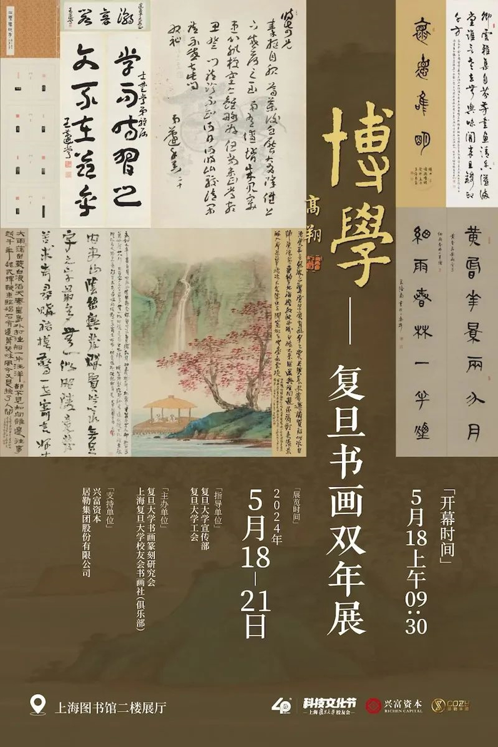 恰逢庆祝新中国成立75周年和复旦大学书画篆刻研究会成立45周年之际,由复旦大学党委宣传部、复旦大学工会指导,复旦大学书画篆刻研究会、上海复旦大学校友会书画俱乐部主办的“博学-复旦大学书画双年展”,于2024年5月18日至5月21日在上海图书馆举办。