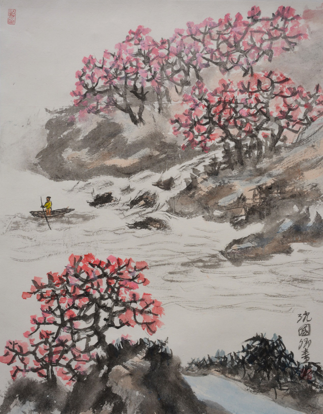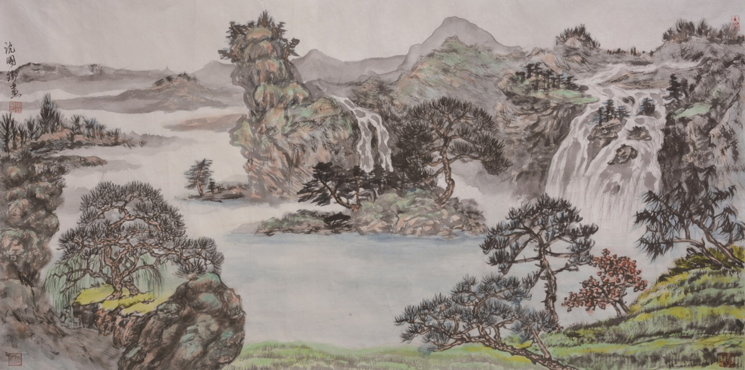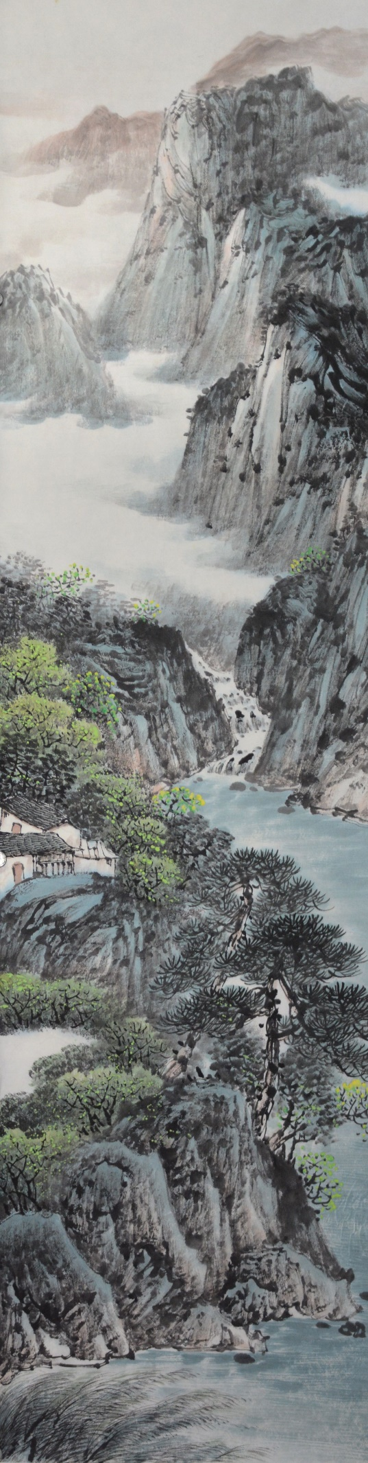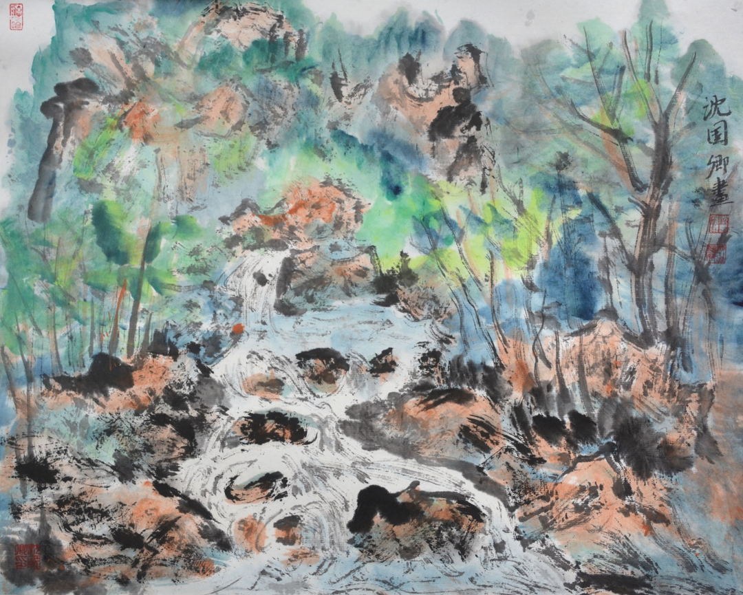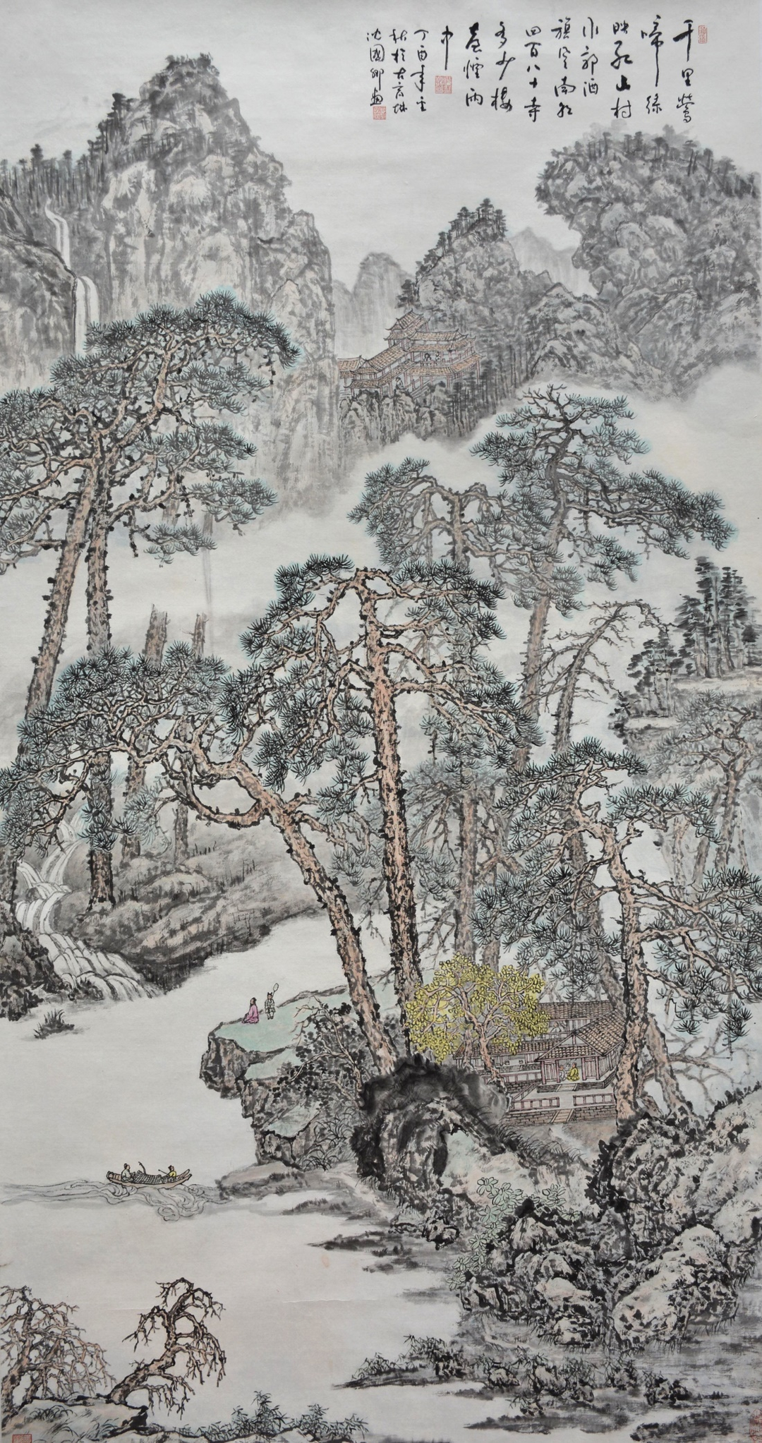 浑厚华滋 气势非凡 ——沈国卿山水画作品赏析 (一) 常言道“画如其人”,此言诚然不虚。沈国卿山水画的审美特质与画家本人的气质别无二致。其审美过程有三变:远观高邈轩昂、雍容大度;细品则温润淳和、闲适自在;深味又体悟到沉厚博大、坚毅恒久的力量深藏其间。让人感觉欣赏好画如品茗茶,醇厚澄澈,回甘绵长。老子曾在《道德经》中提出“道法自然”的哲学思想:宇宙天地间万事万物都遵循“道”的自然规律,然而“道”却“生而不有,为而不恃,长而不宰”,无目的、无意识地听任万物自然而然地发展着。 ![]() 《千里万里春潮起》70×180cm 沈国卿的山水画是那么自然而然,怡然自适,不矫情、不造作、不纠结,与“道法自然”思想高度契合。《道德经》又曰:“致虚极,守静笃”、“夫物芸芸,各复归其根。归根曰静,是谓复命”。静,本是生命哲学的至高境界。著名美学家朱光潜认为,静也是艺术的最高境界。沈国卿的山水画总是悠悠传递出一种静气,这静气象一个神奇的磁场,对观者有着莫名的吸引力。你会不知不觉地走入画境之中,体悟到静中有诗,静中有禅,静中有仁,静中有慧。 ![]() 《我看山脉远,新柏写炉峰》70×180cm 沈国卿用淡墨创作出的远山与近景之间的巧妙留白,既给人烟云缥缈之感,又有咫尺千里之妙,瀑布烟雾、帆船松柏、鸣泉幽谷、浮桥秋枫孤舟似隐似现,茅屋隐约千峰叠翠,崴嵬秀丽、绿树蓊郁,穿插繁密、意趣盎然,笔法遒劲苍厚凝重刚柔相济;墨法丰富表现形、质、动、势,与笔相辅相成。笔墨的神韵与笔、墨、色有直接关系,创作中强调和重视以墨为主以色为辅,色不可夺墨,青绿斑斓而愈见墨彩之腾发。创意风格特色有的以突出的主线来确定山之轮廓与凹凸;有的山石轮廓不作突出的主线条和刚硬方折的笔画,用笔圆曲柔浑;有的却用无数的点来表现,独特的视角多了几分灵动和意趣,赋予画境无限的延展,缥缈之间宛如野渡无人舟自横意境之美,构图和画面虚实的对比,风格洗炼,颇有任心纵逸提炼取舍之妙;构图上讲究气势,幽深高旷静穆峻拔,浑厚华滋气势雄壮;皴法勾线多带有孤线或斜直线,交叉组合然后沿皴的外轮廓或直线两端作点,层层积染情怀激越的恢弘构图,绘就色彩酣畅淋漓壮观多娇的大河大川,细腻写意笔触意境,水云之间,方显山的崇高、树的苍古、石的嶙峋、藤的缠绵、苔的润泽……远山不得连近山,远水不得连近水。 ![]() 《山中习静观朝槿,松下清斋折露葵》70×180cm “重返古典”,显然包含了太多与太复杂的现代精神内容与现代人的心灵渴望。中原画坛沈国卿正是在这一特定的文化背景中进行水墨山水创作的。值得深思的是,沈国卿是以青绿山水的现代画法而一举成名的。他以现代的构成、艳丽的色彩、气势恢宏的意境,在传统青绿山水与现代审美要求之间找到了契合点,碰撞出炫目的光焰。他的作品色彩鲜亮,金碧辉煌,意象丰富,气势磅礴,在古意中洋溢着一种强烈的时代气息,而他的意笔山水却独钟传统笔墨,追摹传统境界,探求古典美感。飞腾的笔势、灵动的墨色与蓬勃的气象纠缠于山川烟云之间,仿佛有一股灵气船运走水、摇山荡谷,带出满纸的笔走龙蛇,万千气象。一工一写,一色一墨,如此强烈的反差,或许可以解读印记在沈国卿山水画上的双重艺术个性和品格,体现了他生活和思想的状态。 ![]() 《山水横拖千里外,楼台高起五云中》70×180cm 在沈国卿的山水画作品中,墨色融合渗透变化极有润致,滋润处用湿墨醒提出用焦墨,运用线条和墨色的变化,以勾、皴、点、染,浓、淡、干、湿,阴、阳、向、背,虚、实、疏、密和留白等表现手法,来描绘物象与经营位置,树木房舍和船只皆用线勾,用线的粗细、轻重和深浅变化,由近及远愈见轻淡,竖划三寸当千仞之高,横墨数尺作百里之回,山水画创作不仅需要传统功力,需要师法自然,还需要美的冲动,有了美的冲动,才是激起强烈的创造欲,美的冲动来源于对山水美的观照,在山水美的观照中,发现山水自身的艺术性,山以水为血脉、以草木为毛发、以烟云为神彩,故山得水而活,得草木而华,得烟云而秀媚。由于风格、气象、修养的不同,这些符号的内蕴千差万别,但是,在通常情况下,他们的意义共识是一目了然的——或是超然的心绪传达,或是宁静的心灵栖息,或是精神的远游……从沈国卿的水墨山水中,这些意象符号都取自传统,特别是山石的勾勒、林木的点染以及整体意境的营造都不难看出,他对自然、对古典境界、对精神表达的一往情深。 ![]() 《青山绿水皆是赏》70×180cm 在看似传统的点、线、色、墨中,融入了他个人的审美感受与体验,尽管画面中处处流露出复古意境,却不乏清新隽永;尽管一派寂寥,却不乏轻松灵动;尽管平淡天真,却不乏厚重浑然。这一切构成了沈国卿水墨山水画的特点:作品无形因之以生,尺幅之间大气自然天人合一、物我为一、物之我化,大气秀美水色混融交响元素,从而产生一种别样的和谐情趣,韵者隐迹立形备仪不俗,艺术境界笔墨物象虚灵浑成,墨色增加笔重,笔运增添墨感,二者交融相辅相成,注重表现生命活力万物皆有灵性和谐共生,以运笔显其造型,运墨表其灵性,多用线条来增加图像的生命活力,实静却似动,栩栩而如生,笔法、墨法、章法、意境、肌理效果及敷彩,无不融汇在他的山水画中,可谓集中国画技法之大成;他运用散点透视法使层山