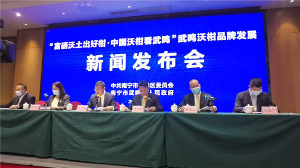 新闻发布会现场 为呵护武鸣沃柑品牌,推动沃柑产业实现持续良性发展,带动乡村振兴。近年来,武鸣区按照武鸣沃柑生产技术规程推进种植标准化,组织出台《武鸣沃柑生产技术规程》《武鸣沃柑生产技术指南》《武鸣沃柑采后处理技术规程》《武鸣沃柑商品果分级标准》等。通过规范产品质量标准、规范使用“武鸣沃柑”公用品牌等措施,提高武鸣沃柑品质。目前,“武鸣沃柑”已获准注册为国家地理标志证明商标,并获评2019、2020年中国农产品区域公用品牌市场新锐品牌、入选中国、广西特色农产品优势区、广西首批“桂字号”区域公用品牌,“鸣鸣果园”沃柑号首趟进京专列动车组,出口加拿大、俄罗斯、新加坡等国家,武鸣沃柑已经成为新时代武鸣的闪亮“名片”。