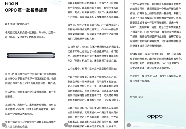 谈及对于Find N的打磨过程,刘作虎在微博长文中提到,此次的Find N新品是一款历经4年6代打造的折叠屏旗舰。据了解第一代原型机在2018年4月就已经在内部诞生,但从近些年折叠屏产品的发展经历来看,用户对于可用性、耐用性和创新体验上仍旧有着高标准,折叠屏手机距离「常用」机仍有一段的距离。因此,OPPO团队用了四年的时间精心打磨,只为做出一款用户“没有任何心理负担”的折叠屏手机。