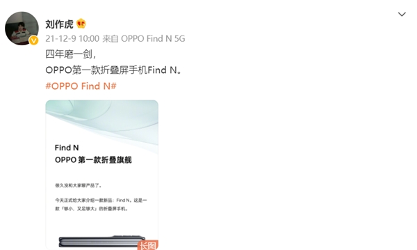 12月9日,OPPO高级副总裁、首席产品官刘作虎官宣首款折叠屏旗舰Find N,同时还在长文中表示,“Find N是OPPO对于智能手机下一程发展的回答,也是我回归 OPPO 负责产品后感到最为激动的一款产品。” 据悉,全新的OPPO Find N将于12月15日的INNO DAY正式发布。
