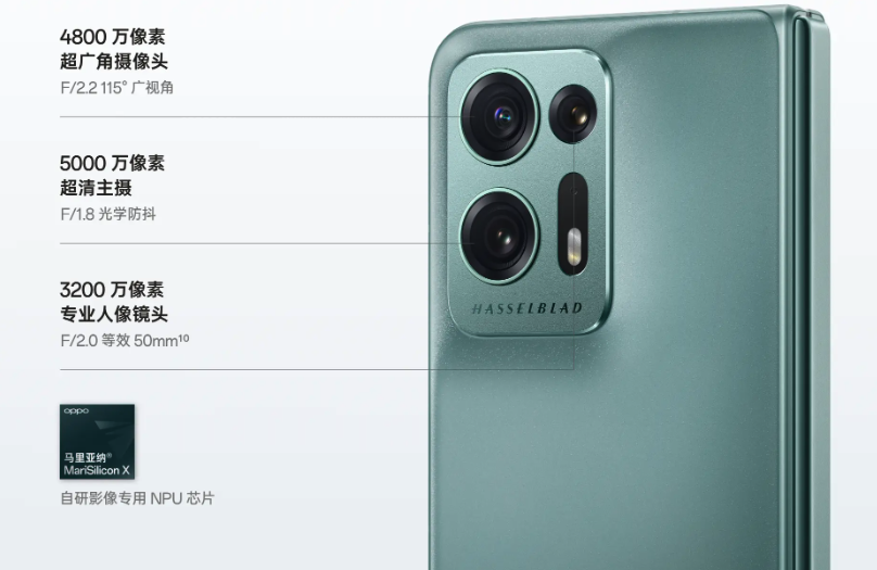 OPPO Find N2在影像方面加入了5000万像素IMX890大底主摄+4800万像素超广角镜头+3200万像素2倍长焦镜头的三摄组合,配合OPPO自研影像芯片马里亚纳® MariSilicon X NPU芯片,OPPO Find N2可实现4K 30FPS超清夜景视频拍摄,将折叠屏的影像实力再次拔高。而哈苏影像系统的加入,让OPPO Find N2拍摄出来的照片色彩更加出色,轻松拍出影像大片。