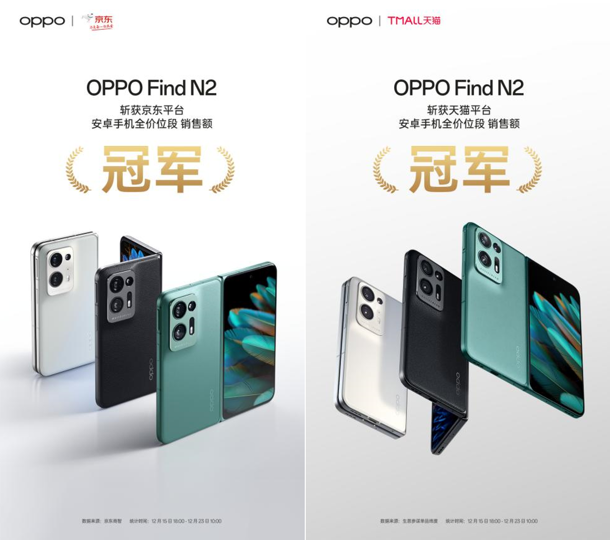 12月23日早10点,OPPO Find N2正式全渠道开售,12GB+256GB售价7999元,16GB+512GB售价8999元,此次开售共有云白、松绿、素黑(素皮)三种配色。作为OPPO最新款折叠屏旗舰,Find N2在屏幕、铰链、影像、系统等多维度进行了升级和优化,首销当日便斩获京东、天猫平台安卓手机全价位段销售额冠军。