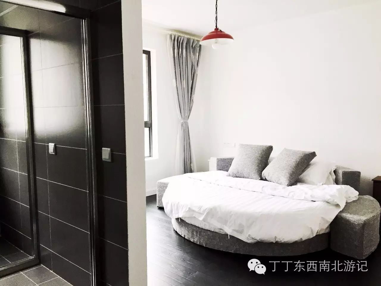 “采溪”里唯一一间圆床房,充满了时尚感,用了二丁最喜欢的黑白灰的色调。