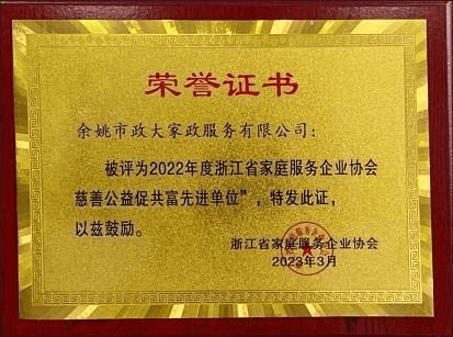 随着经济的发展,现代信息技术的广泛应用和家庭消费能力的提升,家政服务从传统被动型向科技主动型升级越来越迫切,未来家政服务涵盖的项目越来越丰富,服务内容越来越广泛,从业者将越来越职业化。所以说,谁能做到以上的快速升级,谁就会得到客户、得到市场、得到未来。 党建引领,示范带动作用 公司成立后,经营硕果累累,屡获殊荣,经过多年发展,形成了特有的企业文化,在经营方式上充分体现公益性和服务性,采取“让天下没有难做的家政”的企业使命,使企业在竞争激烈的市场中脱颖而出,各项业务稳步推进,在行业内有明显的示范带动作用。先后被评为2020-2022年度浙江省家庭服务企业协会慈善公益促共富先进单位、省级家服助推未来社区先进单位,宁波大数据发展协会会员单位,余姚市第十二大科学技术协会代表,余姚市工商联工坊共富定点单位、余姚市家庭服务行业协会副会长单位、余姚市家庭服务行业协会同城物(搬家)专业委员会等等荣誉。