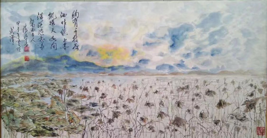 潘德来作品赏析 一带一路成为国家强盛的新兴大计,潘德来难掩激动情怀,依习近平访问法国时所谈中国是一头醒来的狮子的哲思为主旨,精心创作《醒来》一幅作品,以寓意化的构图方式,绘成荷花为美,红绛为神,霞托日出,云染五彩,醒来之意,被巧妙地寓意在自然的动态之中,取意境,成美韵,不施教化,无声胜有声,丹青尽是中国风。醒来之意,丝丝缕缕,生于天地,缭绕心田,墨色的氲氤有厚有逸,笔画筋骨有显有没,虚为写意,实为工笔,既有齐白石似与不似之间的精妙,又有工笔重彩的庄严肃穆,还引入了油画的光影与透视,可谓中西结合,可达南北,对一带一路精神的表达切意实成,是同类题材中的精工作品,被多家出版刊印,作品功能已经超越了画质本身,进而成为国家理想的代言宣誓。主旨之功,依此可见。他的画笔总是这样关注国计国事,主旨高端,自是必然。
