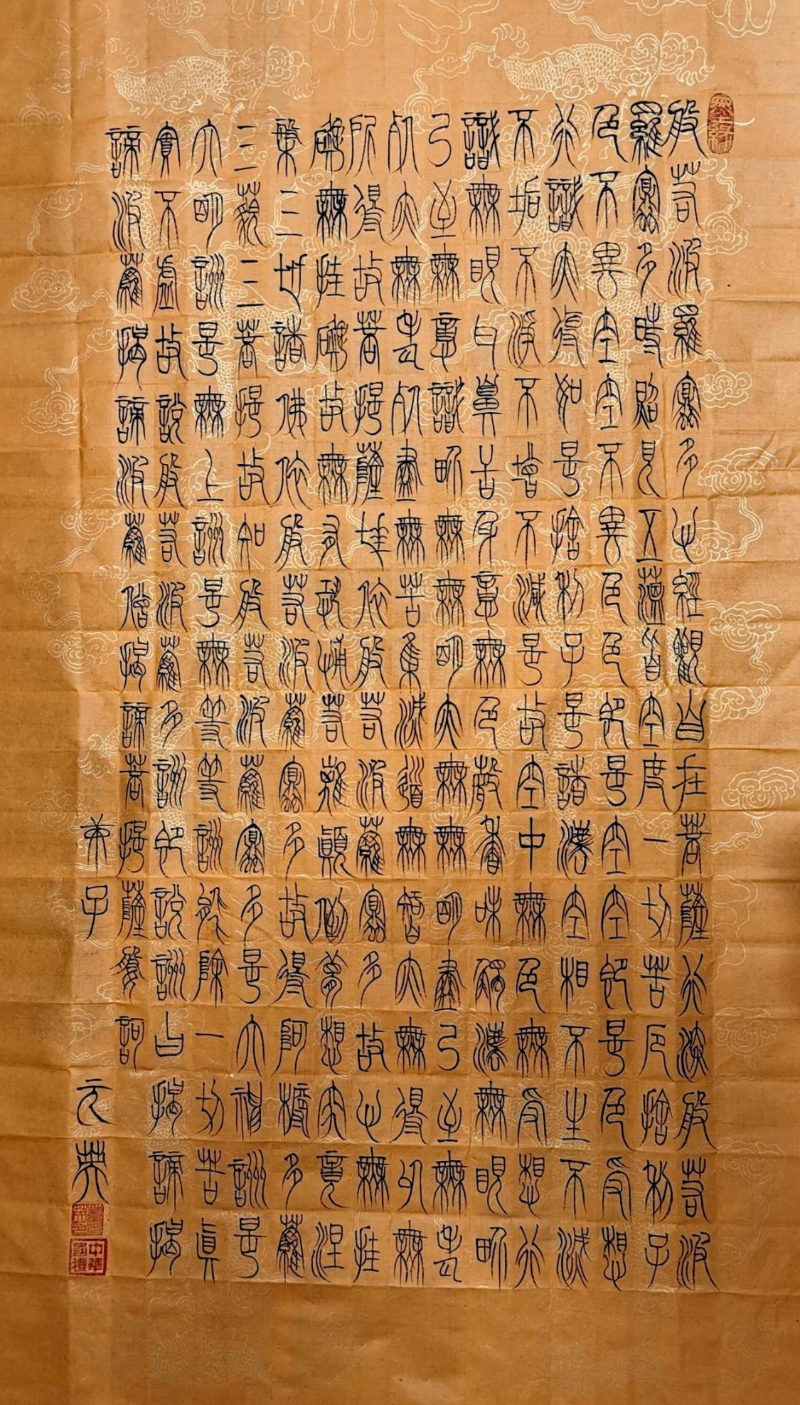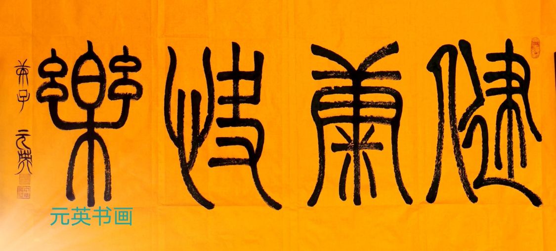 董元英女士的篆书着重于书法中的空灵、内涵和哲理,以其所蕴涵的艺术精神,将传统特点,时代特性,还有个性巧妙地相互融合,渗透其文字性、内容性、文意性等方面。将线条以立体结构呈现,通过视觉光影,最终形成的效果,极具传统浮世绘的审美趣味。可以看出,董元英女士的书风很正、很大气,纯正的气息中透露着典雅俊逸的风韵,渗透着一股端庄之美和荡气回肠之意。以字作骨,意作魂,意随心到,笔随意动,其注重线条质感与形态的变化,使之形成不可分割的整体,最终达成意蕴与哲学的完美融合。让观者感受到神采飞扬的律动、宛转悠扬的节奏、洒脱豪迈的气魄。这是因为她在时刻追求表现当今时代的气韵、气势,以及用心灵表现在书法艺术上,秉承传统的文脉,延续民族精神,融入当代审美,站在了时代的新高度。