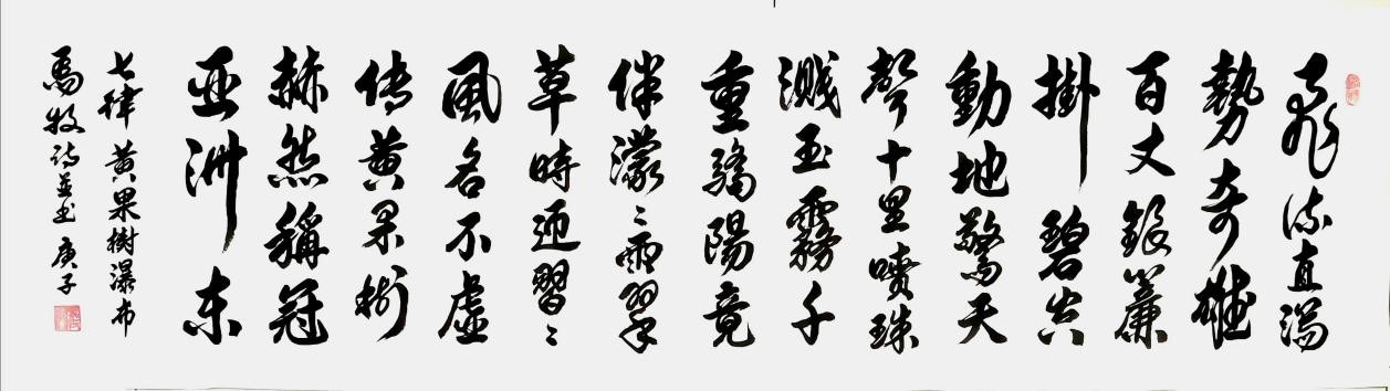 马牧诗并书七绝《高原黄河咏》 奔腾万里气何雄,为我高原系彩虹。 今日金城关下过,明朝飞至泰山东! (辑入《五四以来名家诗词选》)