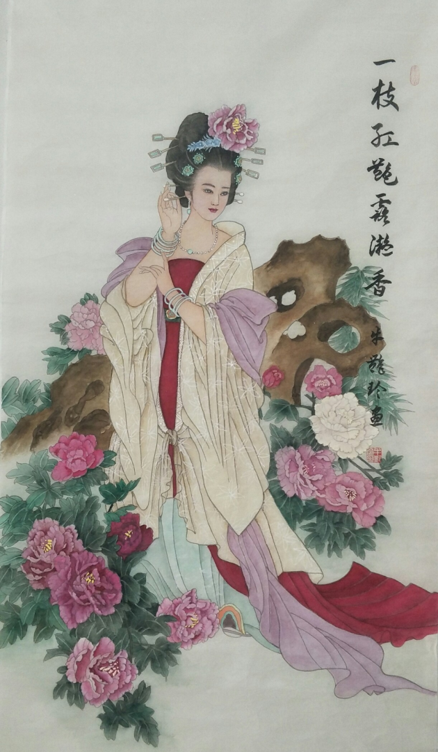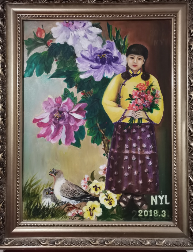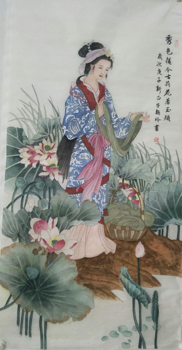 2017年10月作品《工笔人物》参加“庆祝河南大学建校105周年校友书画展”并被河南大学收藏; 2019年6月,工笔画作品《花开时节动京城》入选“丝绸之路”港澳书画作品交流展,并被授予优秀书画家荣誉称号(香港国际书画院、甘肃省收藏协会); 2020年3月,工笔画作品《国色天香》入展第六届中国廉政文化书画展并获精品奖(最高奖项)(中央党校、中国法学会、中国文联、中国美协、中国书协等作指导单位,中国行为法学会廉政研究委员会、中共北京市丰台区纪委等主办)。 中国工笔画历史悠久,源远流长,起源于战国,盛行于唐代,成熟于五代、两宋,创新发展于明代。明末清初,由于西洋画传入中国,中西合璧,相互借鉴,从而使工笔画凸显出造型的准确性、线条的自然性及内容的诗意性。牛艳玲善于继承中国悠久的文化艺术传统,精通中国画、油画、素描,其中尤擅长工笔人物,兼工笔花鸟、山水以及书法、篆刻,可谓“全材”。 牛艳玲自幼受其当老师的父亲牛惠卿熏陶酷爱书画,早在1991年她在开封市电缆厂当工人时,其工笔画作品《宝莲灯》就被开封市文联评为最佳优秀奖,彰显了她扎实的绘画功底。五十多年来,无论是在工厂务工,或是下岗失业、生活困顿,或是在社区当主任,服务基层群众,忙于繁杂工作琐事,都没有阻止她对书画艺术的孜孜追求和潜心探索。她先后拜师于河南省美术家协会副主席、河南大学艺术学院教授、著名画家袁汝波,河南大学艺术学院教授、著名画家薛声韵并成为薛教授的关门弟子。同时,牛艳玲坚持向历代著名画家学习,每天临摹历代画作不少于六个小时,一年四季无论寒冬酷暑,或是生活工作再忙也雷打不动。临摹早已成为她的必修课,画画创作亦成为其生命中极其重要的组成部分。在工笔人物方面以临摹唐代阎立本、明代仇英居多,在工笔花鸟画方面以临摹五代黄荃、徐熙居多,工笔山水以临摹宋代李成、明代唐寅居多。牛艳玲摹古而不拘泥于古,逐渐形成了自己的工笔画画风:形神兼备、清新脱俗。牛艳玲在其工笔人物作品《寿星图》创作上画法工致细腻,衣饰高贵典雅,更表现出了老寿星慈眉善目、笑容可掬的神态气质,又如艳玲在其工笔花鸟画《听秋》创作上表现出了鸟儿活跃之态,栩栩如生,且翎毛工细逼真、呼之欲出,又对秋荷形态色调表达精致准确、清新脱俗;再如艳玲工笔牡丹作品《花开时节动京城》对牡丹花的叶、瓣、蕊画出了光色艳发、妙穷毫厘的富贵、形态与神韵,同时通过细观游戏的蝴蝶,可以确定所画的是中午前后这时间段的牡丹。