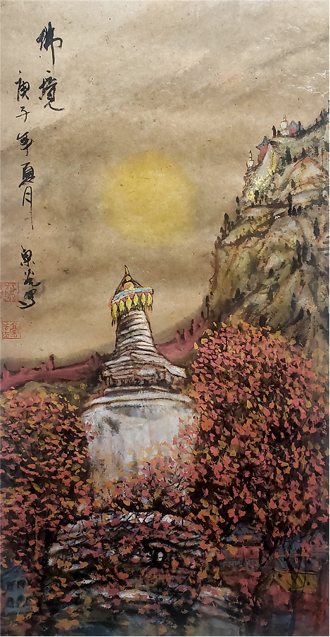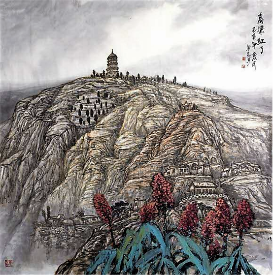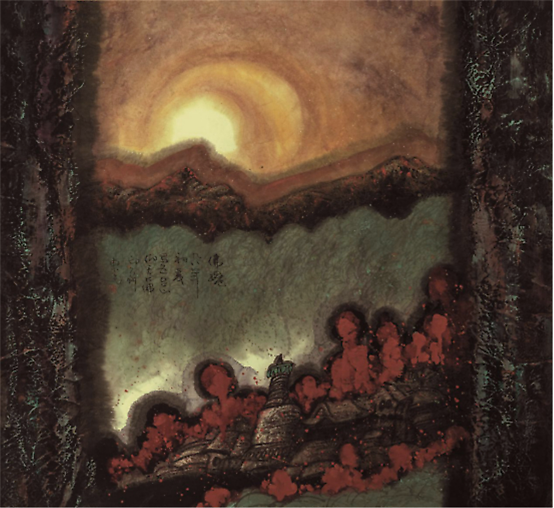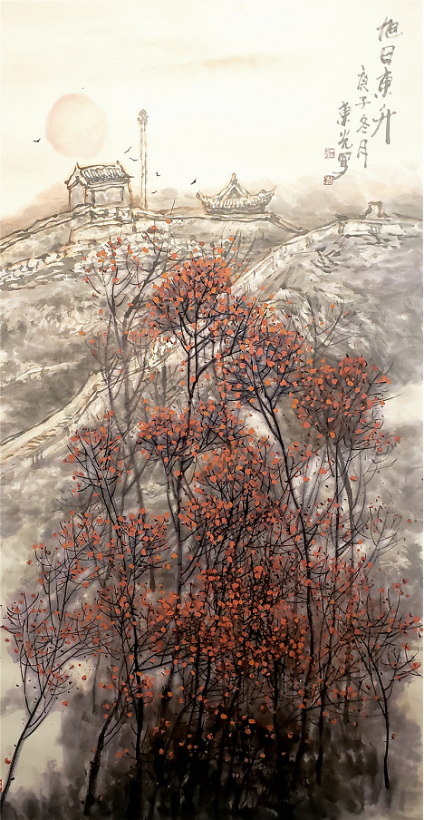 细加推究,韩东光的绘画首重一意字,终成一境字,画山乡题材虽单一,立意则幅幅有变。如《塬上春》之万象更新,《高原盛夏》之郁郁葱葱,《朝霞》之满天祥瑞,《静夜》之明月高悬,《佛境》之佛光常驻,《秋韵》之万山红遍,《冬晨》之茫茫雪韵,等等,图式结构、章法布局、丘壑安排、形式构成、色彩处理、笔墨表现,皆因立意而变,强化感受,深化意趣,浓缩成一种中国化的田园之思。正因为他的山水画皆从生活中来,从真实的山水中来,但又不照搬自然,是意与境、情与理、神与形的交汇体,所以他的作品虽千变万化,幅幅不同,但无一不别出心裁地表达了人们共同向往的境界和自己的独特感受,所以我将韩东光的山水画定位于从传统走向现代的“彩墨乡情山水”。