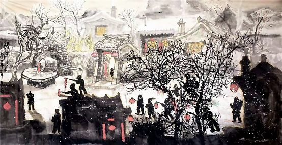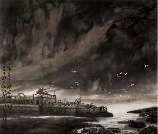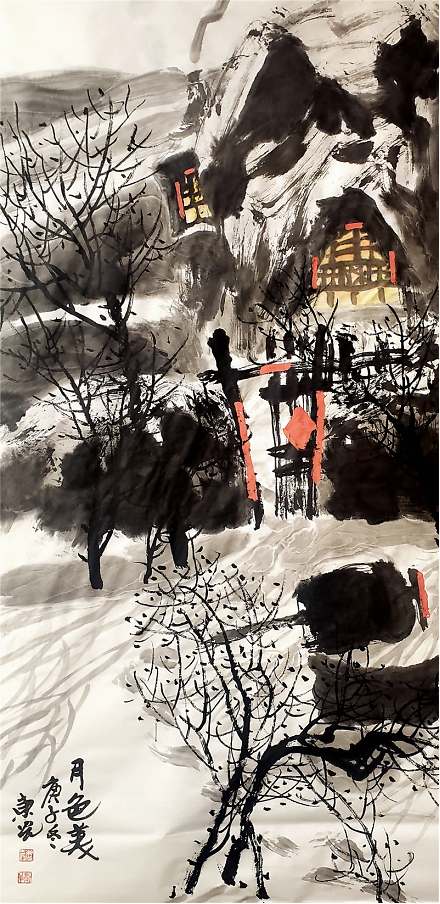 其二,在保留较多的传统笔墨技巧和中国画笔墨韵味的同时,韩东光有意识地参融了现代艺术点、线、面的构成意味,所以他作品中的组合方式完全不同于古人。相较而言,古人的笔墨构成显得慢条斯理、含蓄典雅,而韩东光的笔墨构成显得奇异突变、闪烁动荡。进而言之,古人的笔墨非常讲究点线的微妙变化及笔墨的完整性,而韩东光的作品则追求笔墨的高度单纯和洗练。比如,当安排画面黑白关系时,他并不追求多层次的变化,而是追求团块的大层次对比效果,有效地强化了笔墨情趣的视觉张力。 其三,韩东光的造型手法迥然有别于古人,或者抓住对象中感受最深、兴趣最浓的部分加以简化概括,或者截取对象特征鲜明的部分,加以精准表现,或者从单体的外形出发,将原型自由地打散重构,简洁化的构图与黑白灰的运用为他的水墨乡情山水画带来了现代感。大笔头的浓淡墨块和点线的交错出现,减少了用笔的密度,水性和纸性的材料特征被强化出来,传统笔墨开始化解,这是对写实性山水的突破。