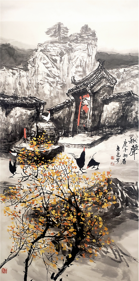 面对熟悉的家乡风情,韩东光极力想用自己的语言方式,记录下他的所见所感所思。如果说山水画的传统发展到今天的形态,有写实和自由书写之分,那么,韩东光选择的是写实的风格,实实在在地去描绘心中家园的美好。如果说山水画的笔墨语言有水墨和彩墨之别,那么,韩东光更愿意以水墨与色彩的结合,去诠释他心中的乡间大地。这一时期,他的画风严谨,构图饱满,注重客观物象的描绘,画得比较缜密,突出了空间纵深的表现。在他的作品中,我们看到了严谨结构下意象的充实,由苍笔勾勒到渴笔皴擦,再到积点、积墨、赋色而成的山体石壁、林木、建筑,不仅表现出水墨语言的丰富多彩,还突出地表现了他对传统山水语言的突破以及对自己绘画语言的建构。
