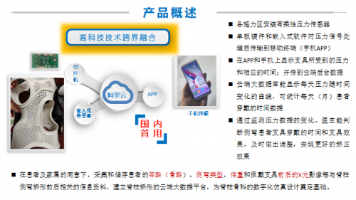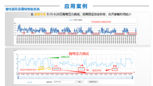 4、智能监控系统助力脊柱侧弯支具 智能监测系统包含档案信息管理、体表扫描数据、X光片存储等功能。就是在传统支具的基础上,增加了压力传感器、数据收集器、手机APP客户端和数据集合的云平台。 通过单片机嵌入式软件对压力信号处理后,转化成曲线,传输到云端,嵌入式传感器中施力区安装柔性压力传感器,终端的手机APP显示压力和对应时间的变化曲线以及有效佩戴时间,云端服务器采集每天压力随时间变化的数据。