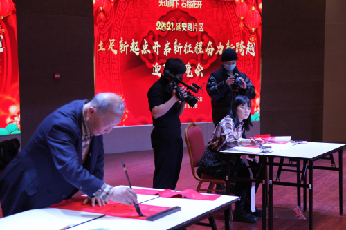 著名书法家冯大同、刘功也来到了晚会现场,现场书写春联,送上新春的祝福。 晚会在歌伴舞《我们前行》雄壮有力的的旋律中结束,市文旅局驻虹湾巷社区“访惠聚”工作队队长毛海中、女高音歌唱家贾倩倩用饱满的激情唱响了新时代新征程的前进凯歌,向前,向光明的未来前行!