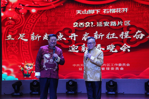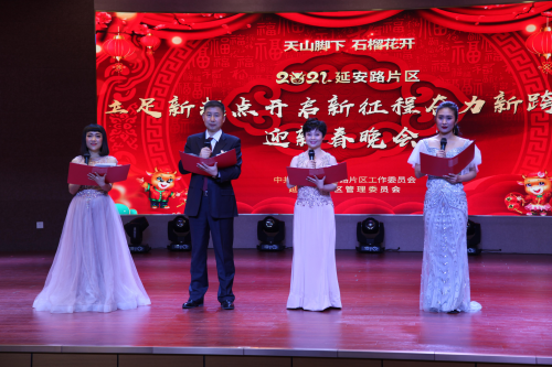 —— 延安路片区举办首届迎新春网络晚会 为深入贯彻宣传十九届五中全会精神和第三次中央新疆工作座谈会精神,践行“文化润疆”,增加使命担当。乌鲁木齐市文旅局驻虹湾巷社区“访惠聚”工作队受延安路片区管委会委托,充分发挥行业优势,于2月2日举办了2021年延安路片区“立足新起点·开启新征程·奋力新跨越”迎新春网络晚会。 来自延安路片区管委会及其所属的13个社区工作人员、“访惠聚”工作队员和受邀文艺工作者通过歌曲、舞蹈,诗朗诵、相声、戏曲等精彩纷呈的节目,展望了美好未来,展现了各族人民对祖国、对家乡的真挚感情和美好祝福。通过网络转播的形式,为居民烹饪了一桌丰盛的“精神年夜饭”。将中华民族共同体意识厚植人心,为中华民族传统节日营造了欢乐祥和的氛围。 身着靓丽民族服饰的模特在舞台上精彩亮相,时装展示《民族团结·秀中华》拉开了2021年延安路片区“立足新起点·开启新征程·奋力新跨越”迎新春网络晚会的序幕。 男高音歌唱家刘超的独唱《道路越走越宽》,社区干部王晓波、何彦宏、彭晓红、钟敏表演的配乐诗朗诵《十九届五中全会谱新篇》,展望了美好未来,展现出走在康庄大道上的中国人的豪情。 碗碗腔《三月桃花》《京剧联唱》让人感受到中华优秀传统文化的魅力。