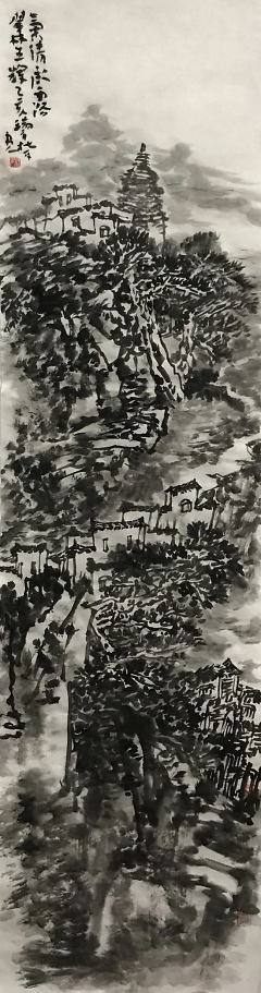 杜平擅长在用墨的过程中掌握笔性,体现出山水画的音乐节奏感。他注重运笔时的节奏韵律,注重用笔的速度和节奏的变化所产生的不同墨韵。他在运笔时,轻重徐急交替进行,点画的长短、粗细、刚柔都有较大的反差,极富变化,增加了作品的生动性和跃动感。画面上的线条,也有如音乐般充满了灵动的旋律,笔势奇纵,连绵不断,起伏迭宕,汹涌澎湃,有一种强烈的贴近现代社会生活的节奏感,表现出生气郁勃的宏大气势,给人以朴拙遒劲的美感。