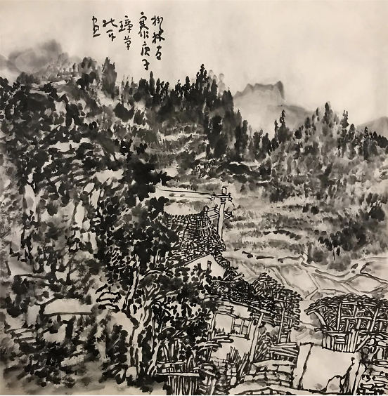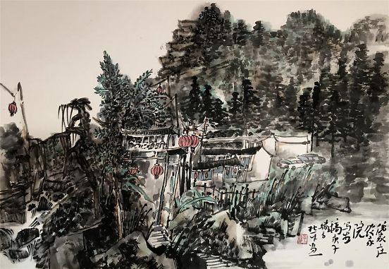 我们看到,在杜平的山水画作品中,笔墨以或急或缓的节奏、或聚或散的墨迹、或涩或润的格调,表现着画家心中的山峦岩石、树木花草,成就着一种特有的气势,烘托着几分古朴的情韵。如他的作品《霄山夜曲》,描绘了一轮满月映照下的山村。长短相谐的笔触,浓淡相映的墨趣,时而疏朗、时而紧密的构图,很好地体现了静谧幽深的意境。正是由于笔墨的熟练运用,让读者更深刻地领略了画家胸中优雅的情怀及其对亲人、友人乃至天下人“千里共婵娟”的殷切期盼。