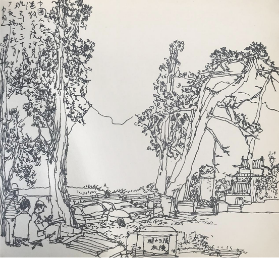 杜平在用线条勾勒山石树木的轮廓之后,又用范宽的“雨点皴”于脉络处皴雨点形状之笔墨,并用淡墨“破”凹处,再在山顶加点。短促有力的笔触,生动地表现出岩石的纹理和质感,画中的山崖峭壁也就显得格外浑厚壮观。