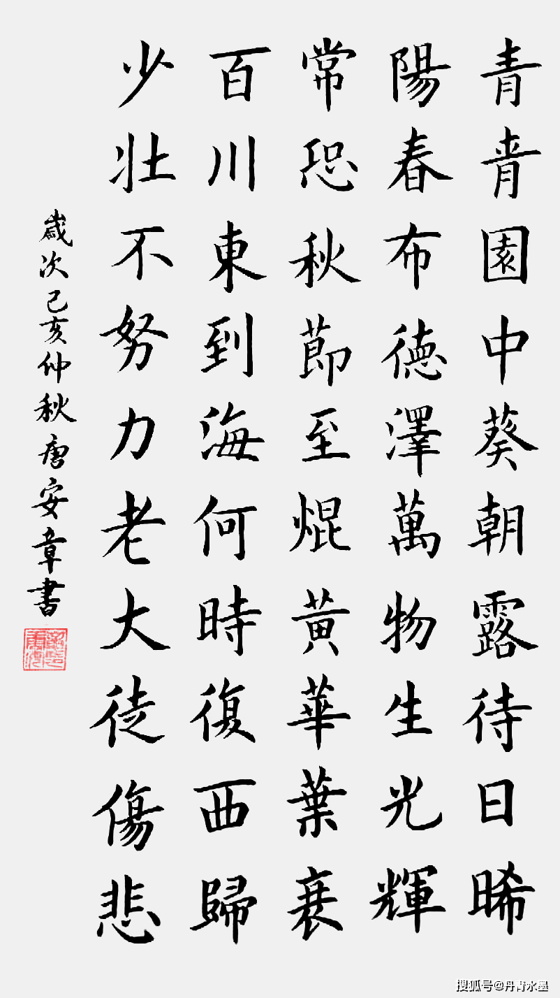 书法法能力高低鉴证,有“楷法无欺”的说法。如若楷书写得无所建树,必是空有书法家的名号。当代书坛,楷书不修,真笔不练的问题比比皆是。楷书能力不足,执笔铺陈笔墨定然不会有力透纸背的神勇。反观唐安章先生的楷书作品,可见真书创作的正大气象!完具楷书无欺的真功夫! 他的楷书以欧楷为根本,用笔平险相依,端正写本,欹险作趣,笔笔到位,必见精绝。又吸纳了颜筋柳骨,侧笔必蓄势饱满而落,努笔可见直中寓曲,啄笔快利,勒笔急去,绝无算子之状,上下非齐平,左右非方整,点画飞仪,翰墨多姿,把楷书的实用性和艺术性调节得相当和谐,恰是文人书风的古今永传。 唐安章先生在着实的楷书功夫而著称,是书坛的实力派。基由楷书修养,再作行草要妙,便显得功到自然成,毫无障碍。他的行草书法,也是临帖悟法的见证,把书法本为线条艺术的真谛表现得无以复加!极其重视笔法塑造线条的多姿多趣!一笔拉过来,如鸿飞兽骇,亦如虬龙蜿蜒,落笔相当利索,从不拖泥带水!这就是临池不辍,因熟而致巧的见证!