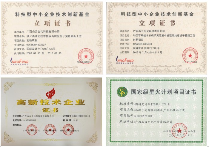 科技兴企——获批多项技术专利,承担国家、省、市众多项目 广西山云生化科技股份有限公司,是柳州市农业产业化重点龙头企业、柳州市科技创新服务示范企业,市辖六县中第一家获得食品卫生A级资质的单位。拥有国家发明专利九项,实用新型专利十二项。利用生物工程技术构建水栀子深加工产业链,生产天然色素、医药原料及副产品,主要产品有:天然色素栀子黄,高纯度栀子苷、京尼平、栀子油等。研发的水栀子综合利用及产业化技术得到了国家各部门认可,承担多项国家级、省级、市级科技项目。2006年9月,公司“水栀子的综合利用及产业化技术开发项目”被国家科技部列为“国家级星火计划项目”;“膜分离纯化技术提取高纯度栀子黄色素新工艺”,“动态萃取技术从栀子黄废液中提取高纯度栀子苷新工艺”,分别在2008年、2012年分别获科技部“科技型中小企业技术创新基金”支持’;“高纯度医药原料京尼平新产品开发”获鹿寨县科技计划项目支持。